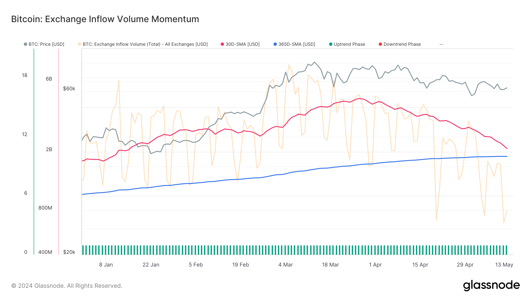 - Exchange Inflow Volume: Initially maintaining higher levels than the yearly average, the Exchange Inflow Volume peaked in late March and has since entered a consistent downtrend. This shift suggests that the positive momentum in market inflows is slowing and might soon reverse, signalling a cooling off of buying pressure.