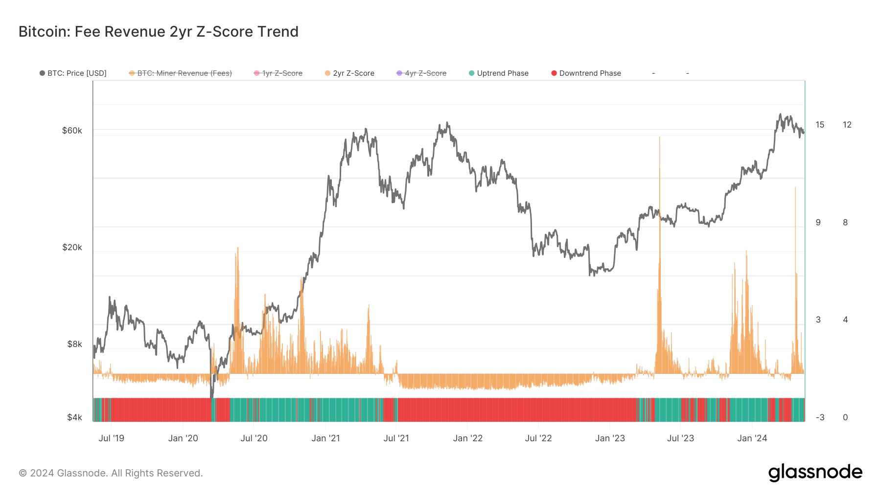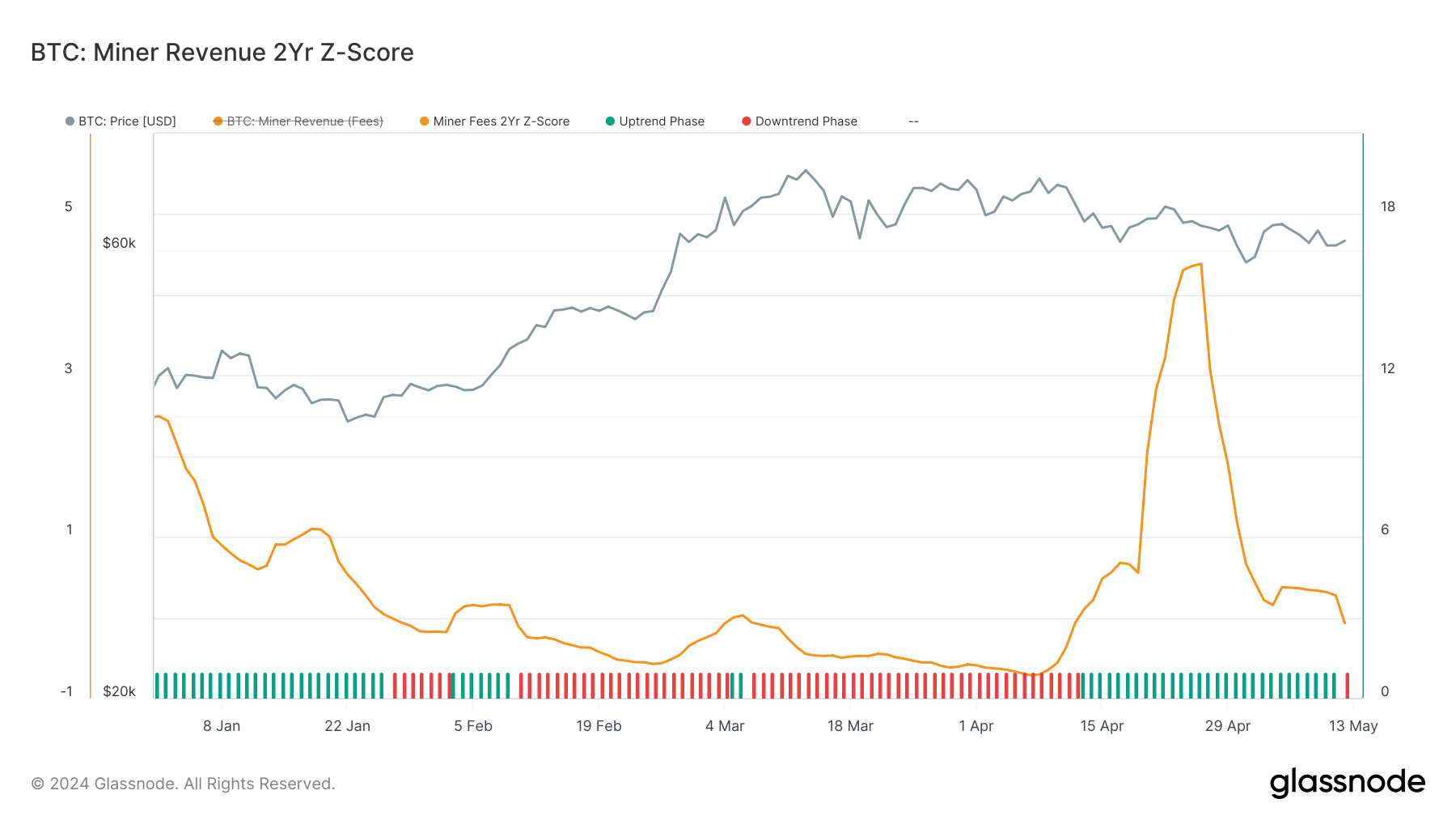 - Miner Revenue 2Yr Z-Score: Following the halving, there was a notable spike in miner revenue as competition for block space intensified, particularly for transactions involving Runes. Although this surge subsided slightly, revenue levels remained above historical norms. Recently, however, the Miner Revenue 2-year Z-Score has entered a downtrend phase for the first time in a month, indicating a reduction in demand for block space.