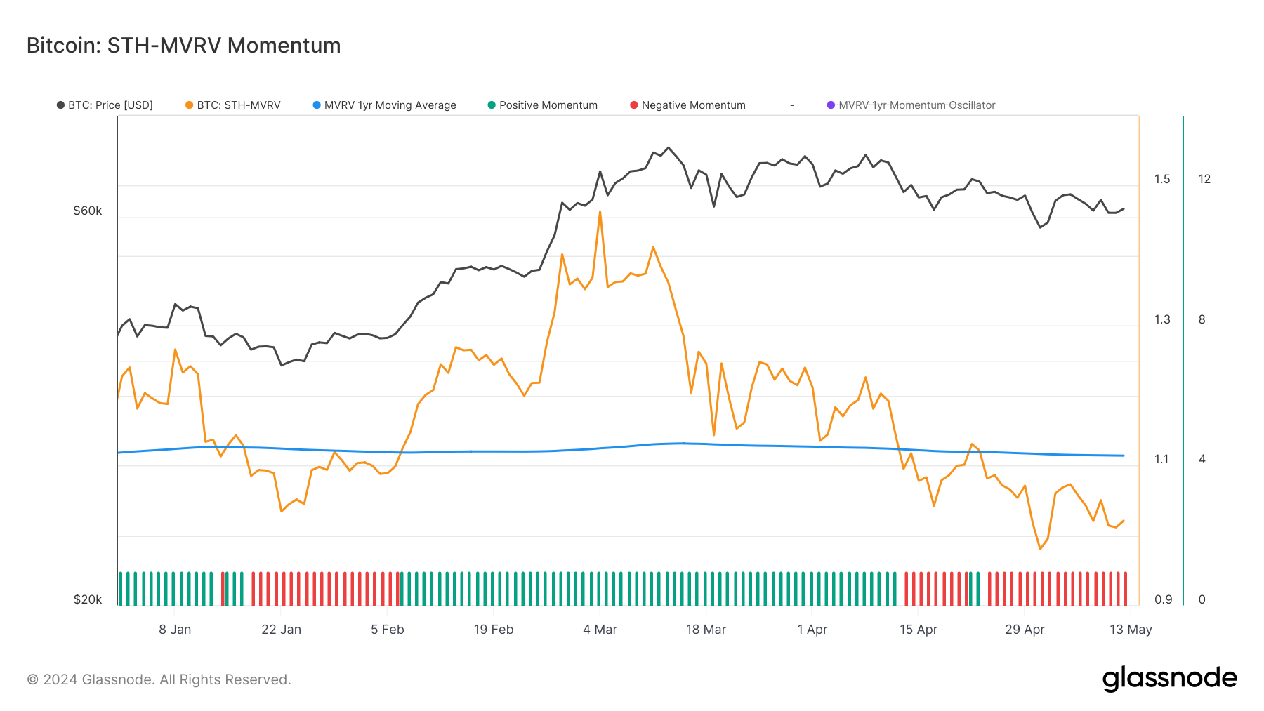 The current market indicators suggest that Bitcoin is experiencing a phase of consolidation and potential correction. With key metrics like Exchange Inflow Volume, SOPR Momentum, and Short-Term Holder MVRV indicating a slowdown in positive momentum and an increase in selling pressure, traders should be cautious. The shift in Miner Revenue and the cooling of SOPR Momentum further suggest that demand for Bitcoin at higher price levels may be waning.