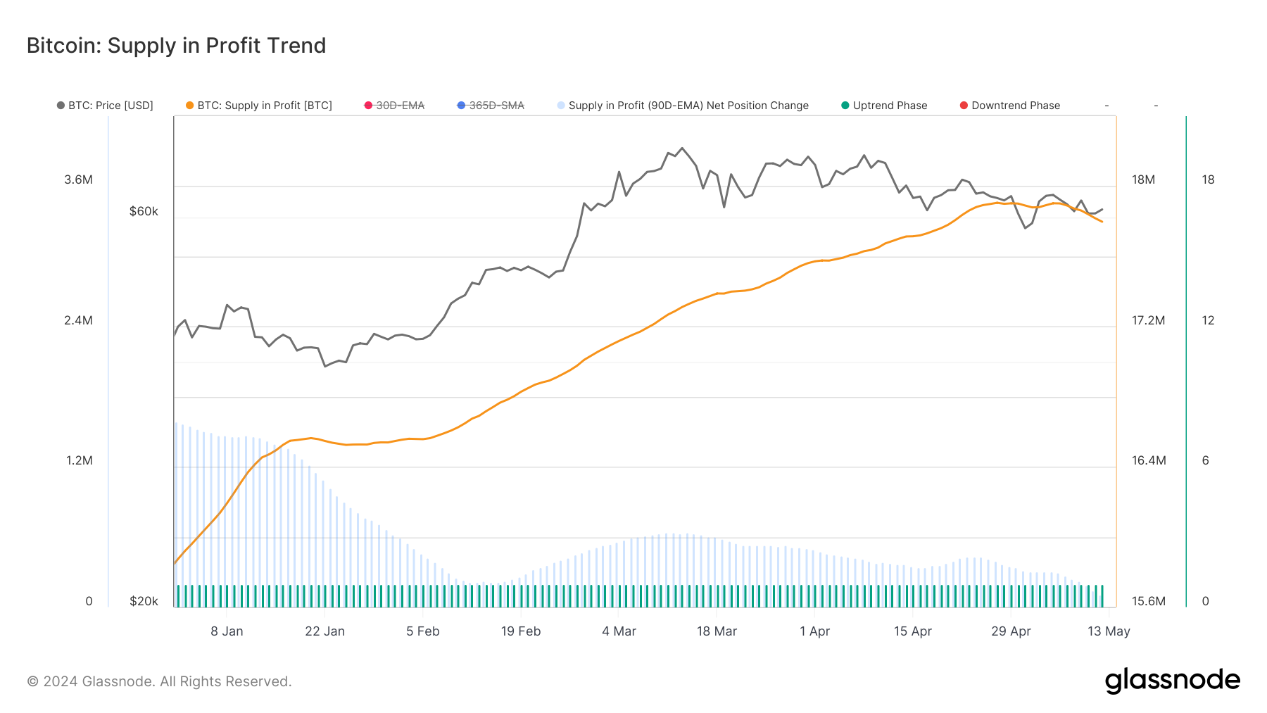 - Supply in Profit Trend: While still showing a positive trend, the Supply in Profit has begun to show signs of reversal, both in absolute terms and as an EMA over 90 days. This metric, although still in an uptrend phase, indicates that fewer holders are in a profit position, which could affect market sentiment.