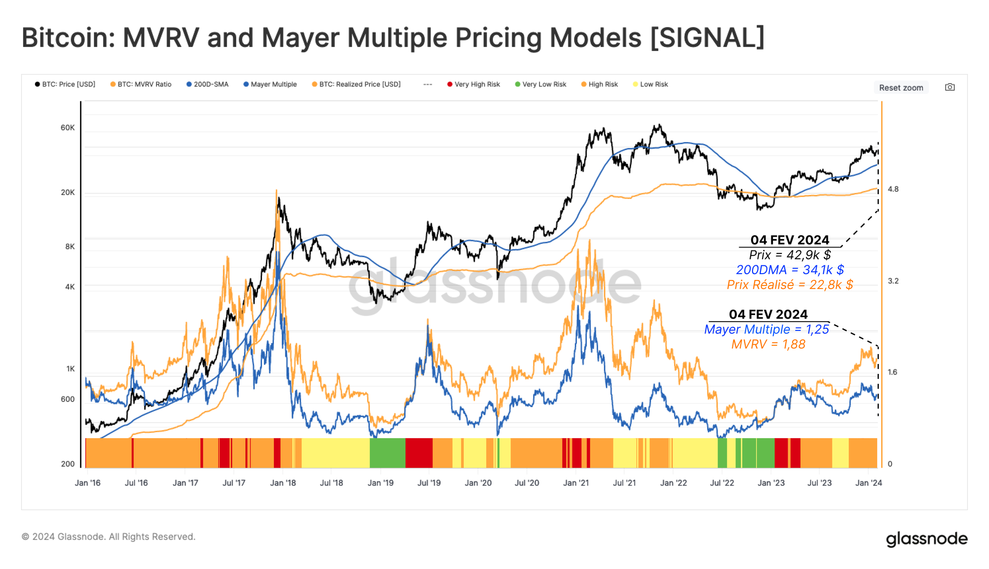 Le prix est supérieur aux deux modèles (MVRV > 1 et MM >1), et le multiple de Mayer se situe à deux écarts types au-dessus de sa moyenne historique (MM > +2 STD).
