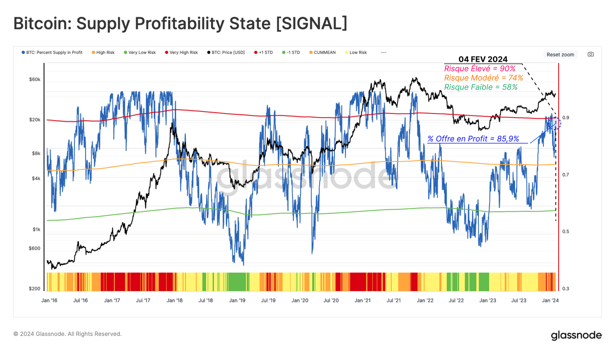 Lors de la récente reprise du marché autour du lancement des ETF Spot, cet indicateur a atteint le niveau de risque très élevé 🟥, ce qui a été suivi d'une correction des prix jusqu'à 38 000 dollars.