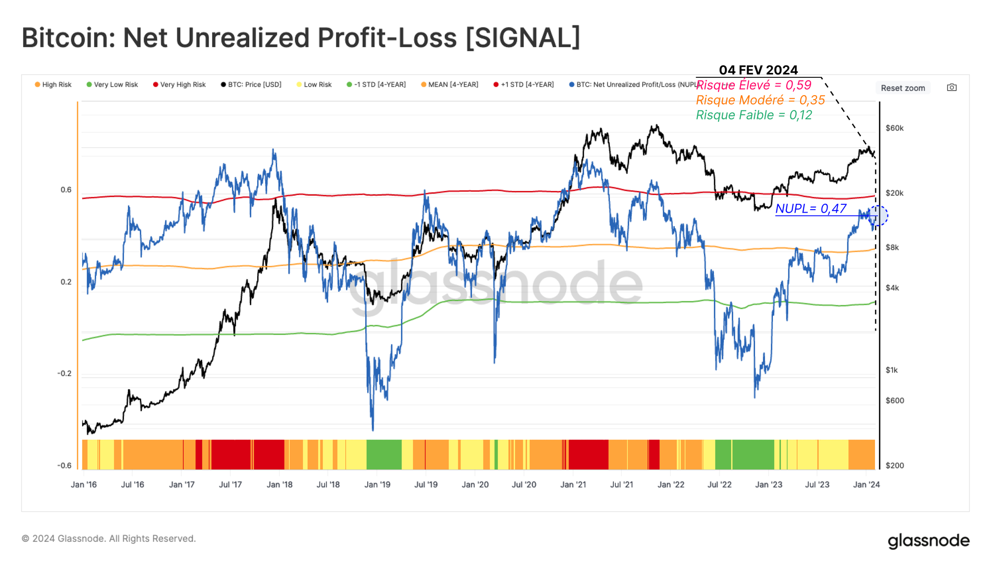 Le NUPL se situe entre la bande supérieure et la moyenne sur 4 ans, ce qui suggère que le marché est en bénéfice net, mais en dessous des niveaux statistiquement élevés (0,35 < NUPL < 0,59).