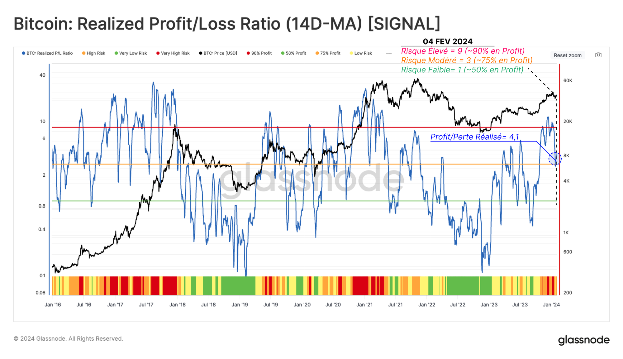 Cet indicateur a récemment signalé un régime de risque très élevé 🟥 lorsque les prix ont atteint le récent pic de 48,4 k$. Le ratio profits/pertes réalisés est actuellement de 4,1, ce qui correspond à un risque 🟧 élevé.