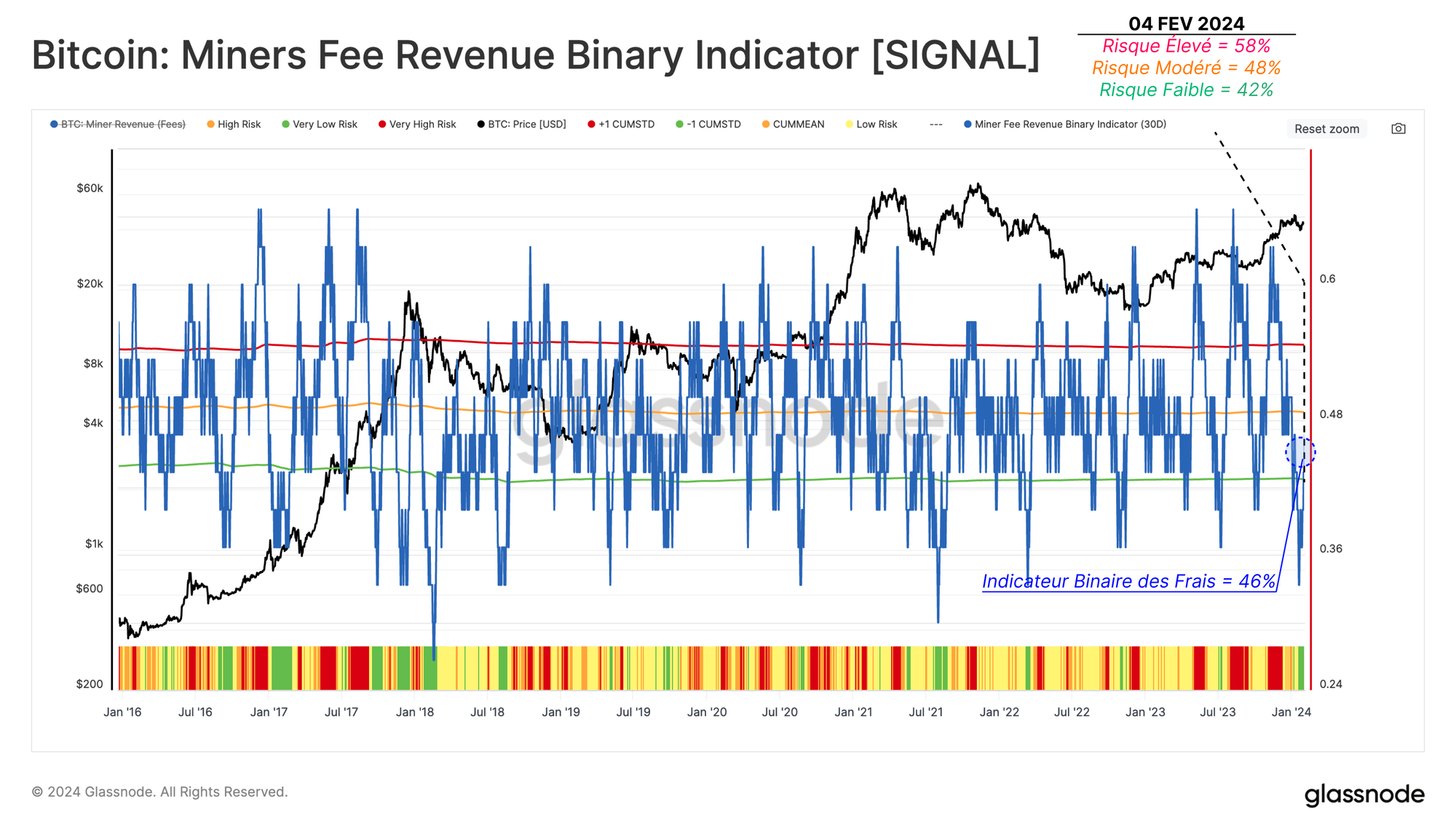 L'indicateur binaire MFR-BI (Miners Fee Revenue Binary Indicator) indique la proportion de jours au cours des 30 derniers jours où le marché des frais a connu une pression croissante d'un jour à l'autre.