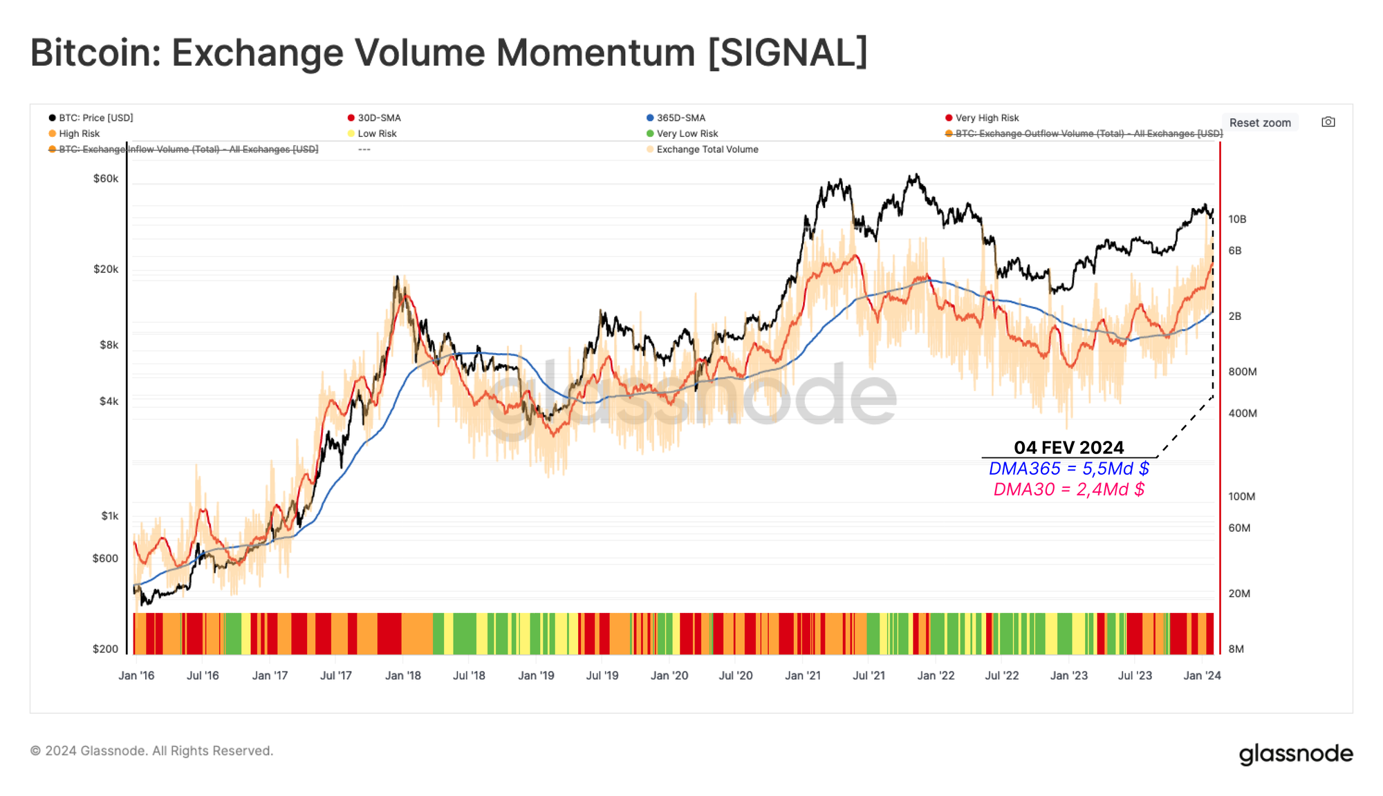 Le dernier élément de la suite d'analyse des risques liés à l'activité est la mesure du momentum du volume des échanges, qui compare la moyenne mensuelle et annuelle du volume transféré de/vers toutes les bourses. Cet outil permet d'évaluer l'appétit du marché pour la spéculation.