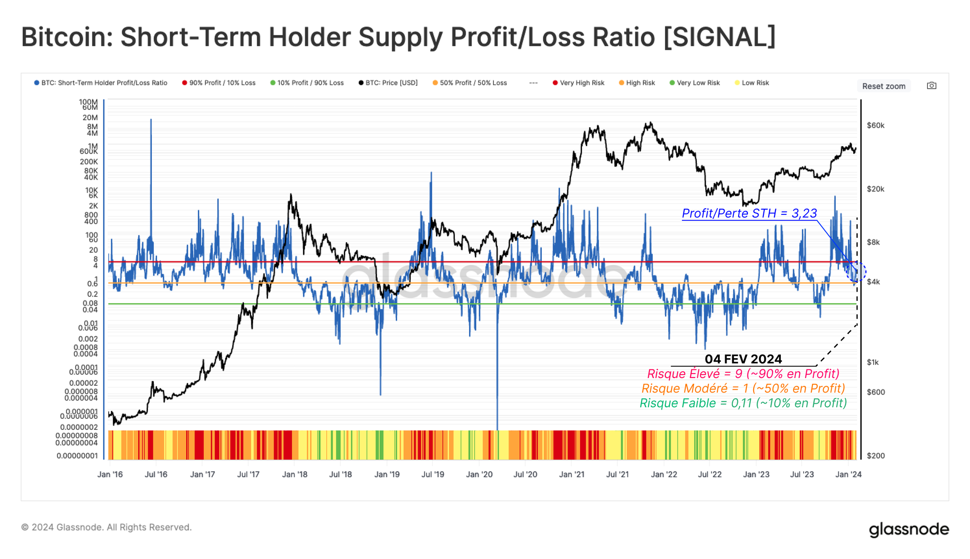 Nous commençons par le ratio bénéfices/pertes de l'offre des détenteurs à court terme (STH-SPLR), qui reflète l'équilibre entre l'offre détenue en profit et celle détenue en pertes par les nouveaux investisseurs.