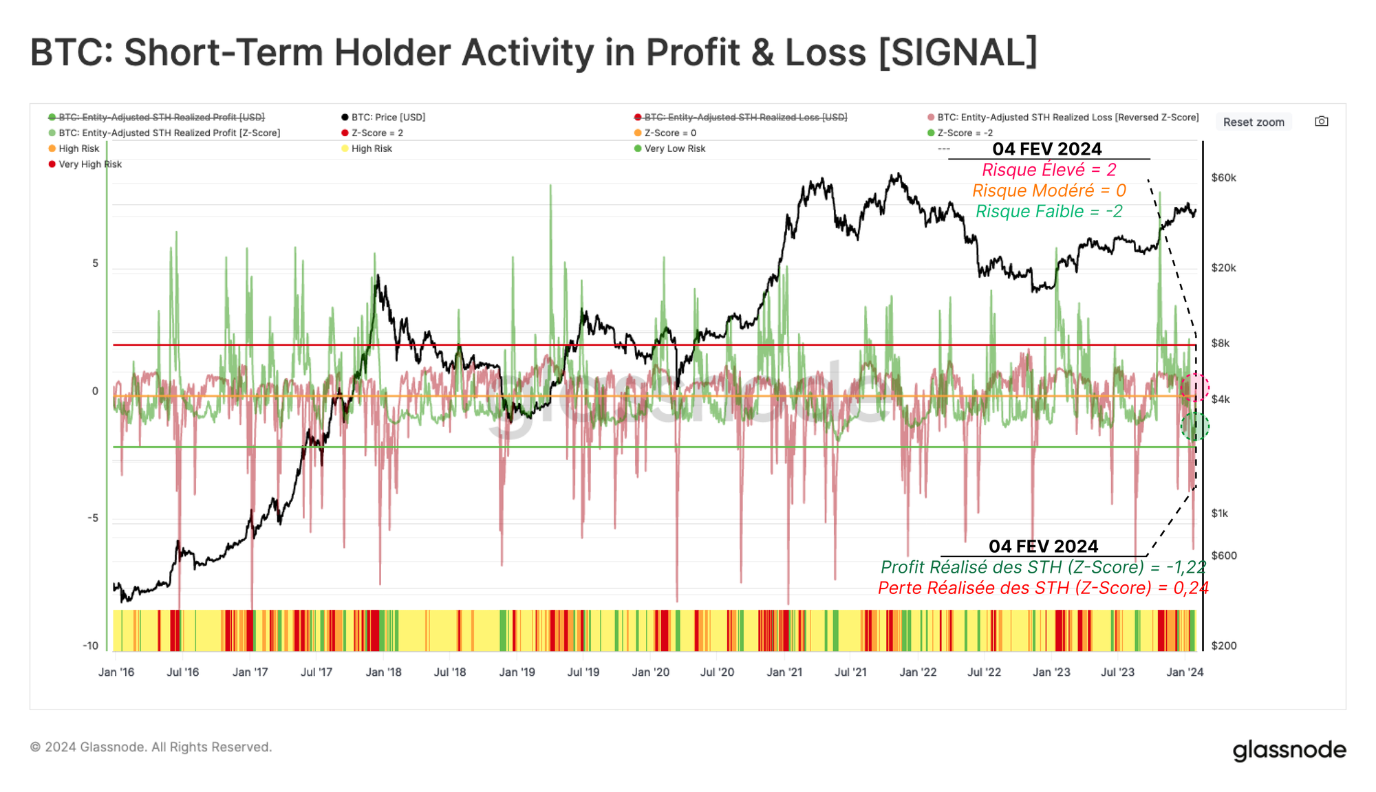 Le Z-score des Profits tombe en dessous de la moyenne 90D, ce qui indique une réduction marquée des prises de bénéfices, souvent associée à une augmentation des pertes réalisées. (Z-Score STH-Profit réalisé < 1)