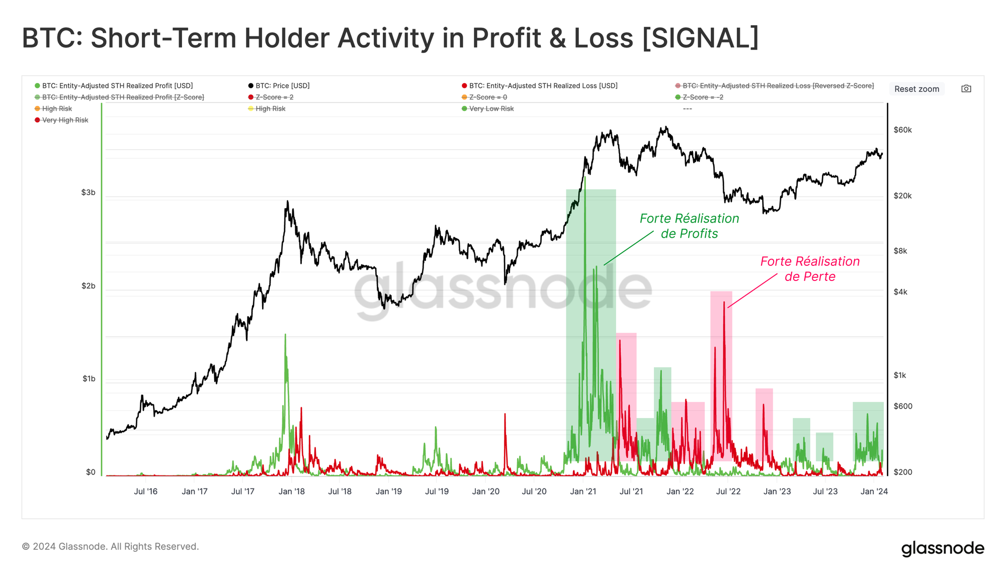 Le Z-score des Profits est supérieur de plus de +2 écarts-types à la moyenne 90D, ce qui indique une prise de bénéfices significative (STH-Realized Profit Z-Score > 2).