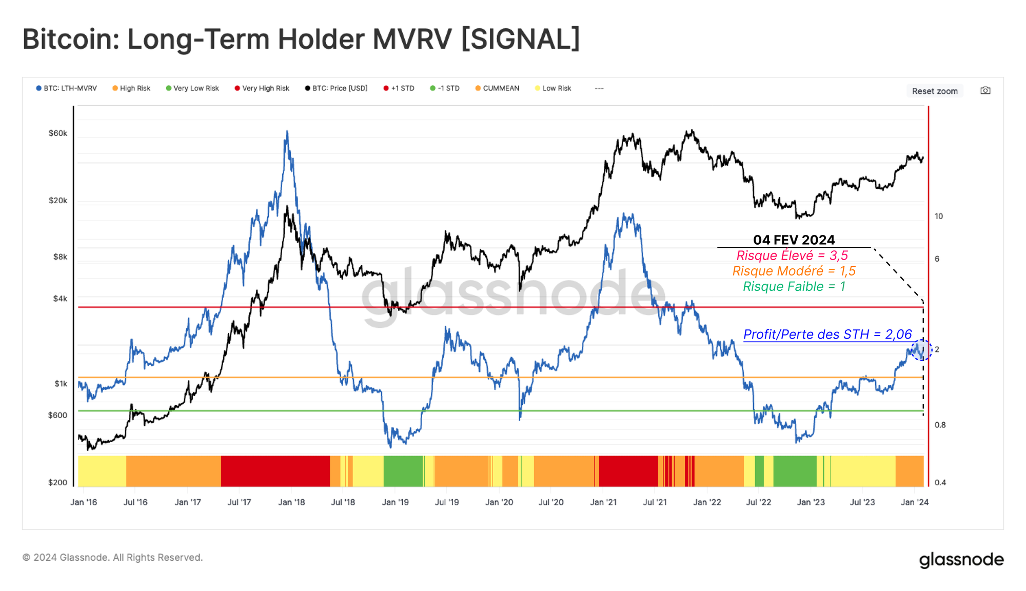 Le LTH-MVRV se négocie entre 1,5 et 3,5. Cette situation est généralement observée au début des marchés baissiers et haussiers (1,5 < LTH-MVRV <3,5).