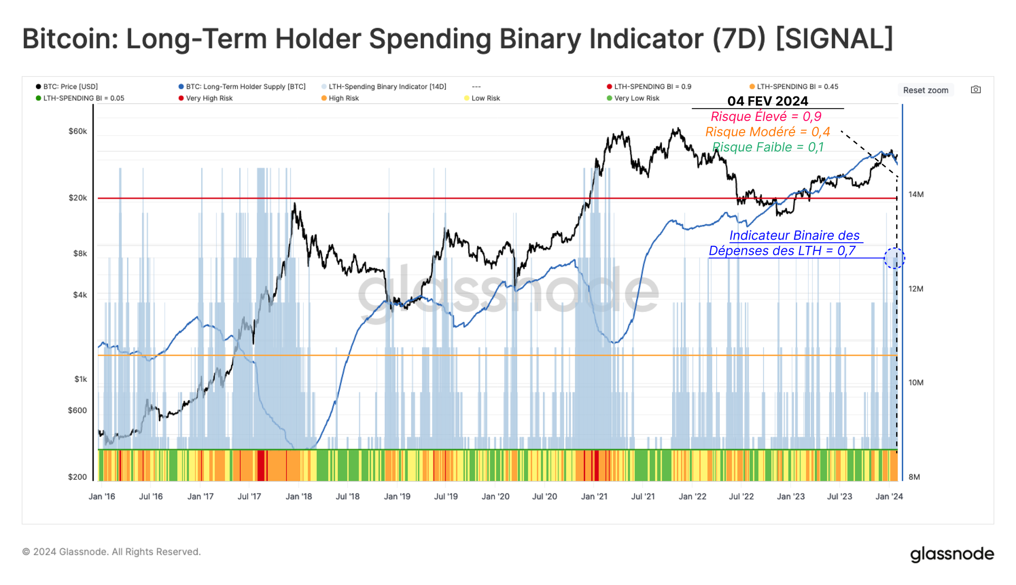 L'indicateur binaire LTH-SBI (Long-Term Holder Sending Binary Indicator) suit les périodes au cours desquelles les dépenses LTH sont suffisantes pour diminuer l'offre totale de LTH sur une période de 7 jours.