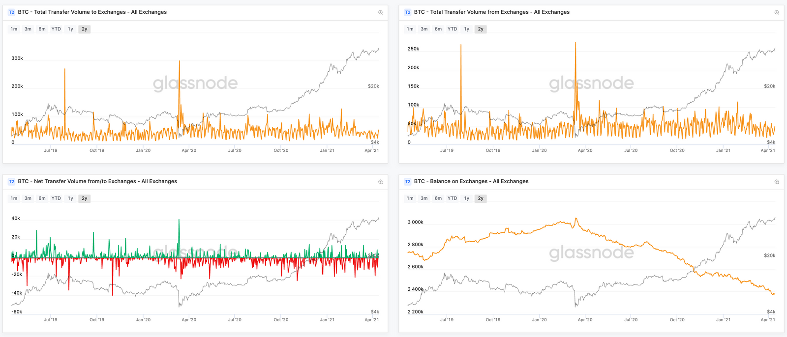 - Les fonds qui quittent les exchanges peuvent signifier que les investisseurs retirent leurs pièces pour les conserver et les stocker à long terme. Cette tendance est plutôt haussière, étant donné que le stockage de BTC dans des portefeuilles en libre-service peut être considéré comme une indication de la conservation à long terme et donc de la conviction des investisseurs quant à la valeur future du bitcoin. Parmi les autres explications possibles, citons l'augmentation de l'activité des bureaux de gré à gré (OTC) et des services de garde en raison des achats institutionnels, ou l'utilisation des fonds dans d'autres services financiers (par exemple, comme garantie pour les prêts/emprunts).