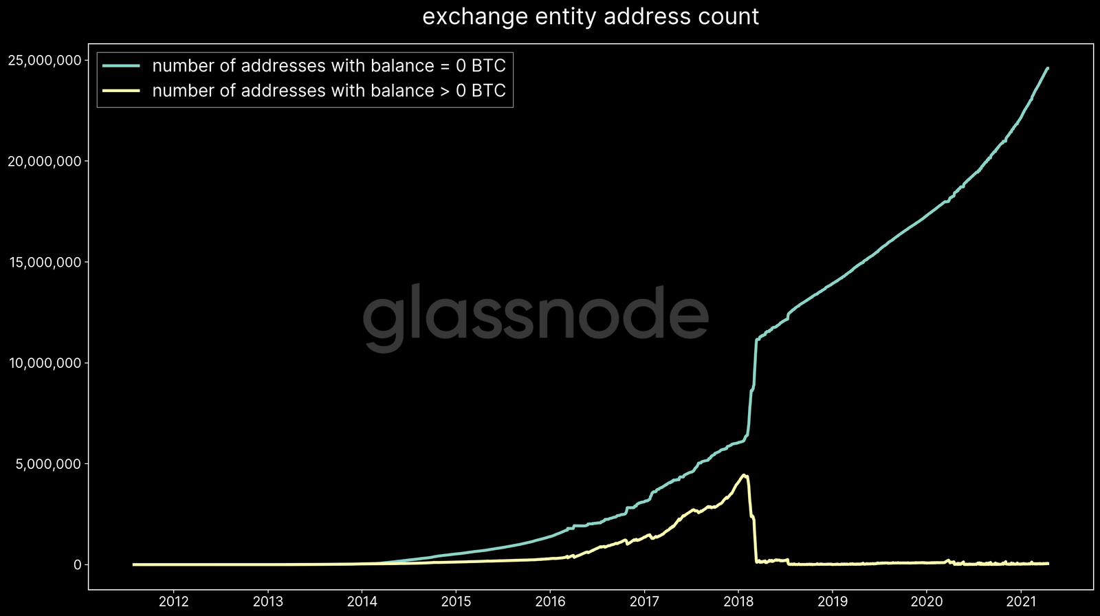 Notez que la plupart de ces adresses sont vides, tandis que le nombre d'adresses avec un solde non nul est resté à un niveau inférieur à 100 000. Ce n'est qu'un exemple de la nature hautement dynamique des portefeuilles d'exchange en constante évolution.