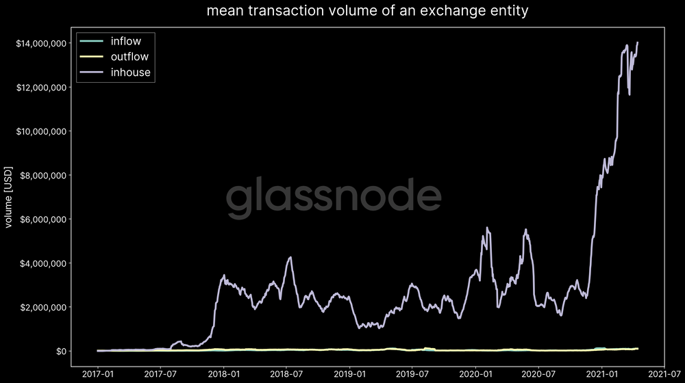 De nombreuses heuristiques ne sont déclenchées que lorsque certaines activités et certains modèles émergent au fil du temps. Notez que cela vaut surtout pour les transactions soudaines et importantes - la taille moyenne des transactions déplacées en interne par les exchanges est souvent beaucoup plus élevée que les entrées et les sorties (Figure 3).