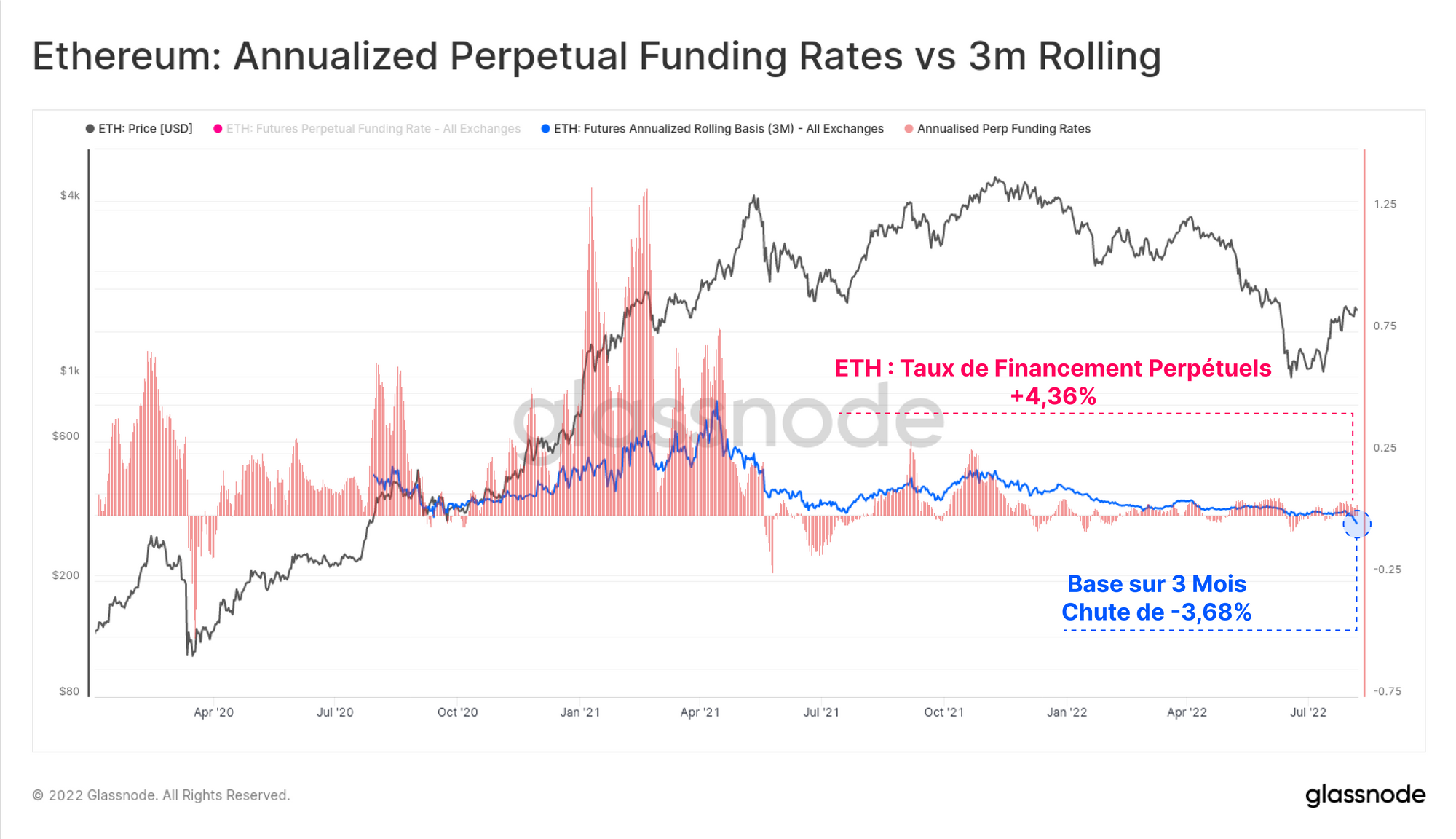 Les retraits au comptant d'ETH sur les exchanges sont cependant relativement faibles par rapport aux récents pics de demande. Cela indique que les traders sophistiqués utilisent la profondeur des marchés dérivés comme instrument privilégié, pour obtenir une exposition au prix et couvrir le risque de l'événement trés attendu que constitue le Merge.