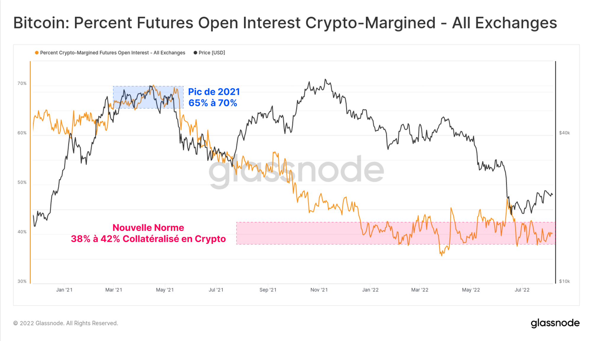 Comparer l'intérêt ouvert en BTC BTC permet d'isoler les périodes de croissance de l'effet de levier des contrats à terme des variations du prix. Sur une base USD, l'intérêt ouvert actuel est de 12,4 milliards de dollars, ce qui est relativement faible et équivalent au début du marché haussier en janvier 2021 mais aussi au creux de la liquidation de 29k$ en juin 2021.