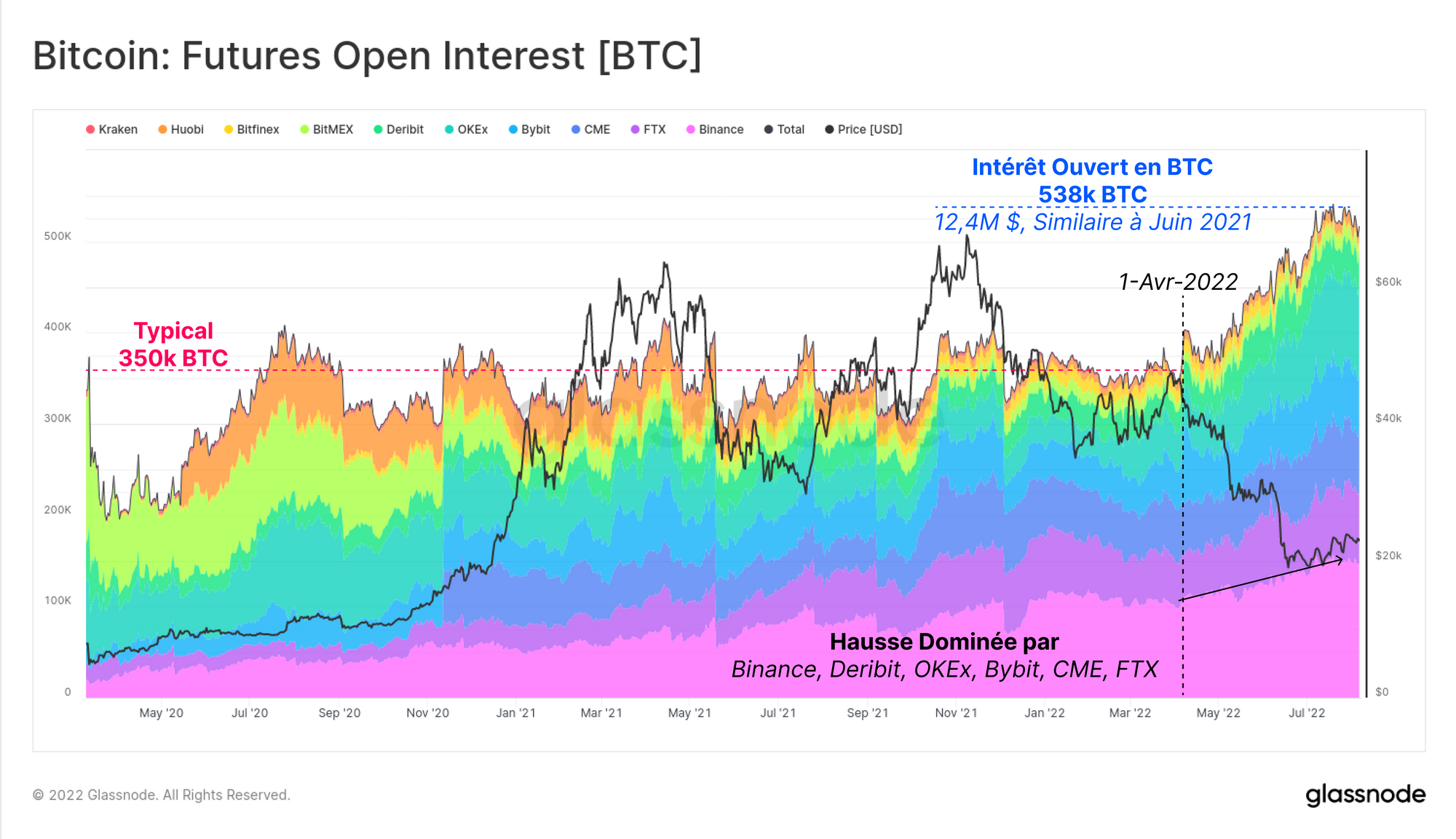 Depuis le début du mois d'avril, les marchés à terme de Bitcoin ont connu une augmentation spectaculaire de l'intérêt ouvert, s'éloignant de la ligne de base d'environ 350k BTC, et atteignant de nouveaux sommets de 538k BTC. La croissance est menée par une poignée d'exchanges, principalement Binance, Deribit, OKEx, Bybit, FTX et CME.