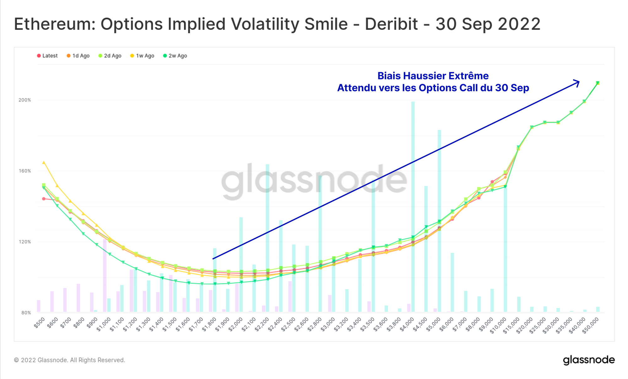 Les barres d'intérêt ouvert sont superposées sur ce graphique, où l'on peut voir que la pente ascendante est fortement motivée par les traders prêts à payer une prime pour une exposition haussière aux options d'achat.