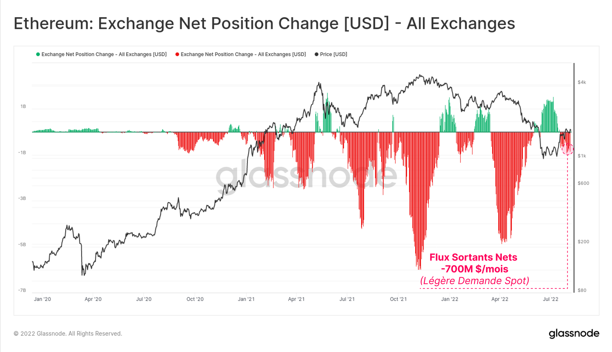 Étant donné le biais fortement haussier des marchés d'options ETH, on pourrait s'attendre à ce que la demande au comptant soit assez forte. Cependant, un coup d'œil à la variation de la position nette des exchanges montre que seulement 700M$ nets sont retirés par mois.