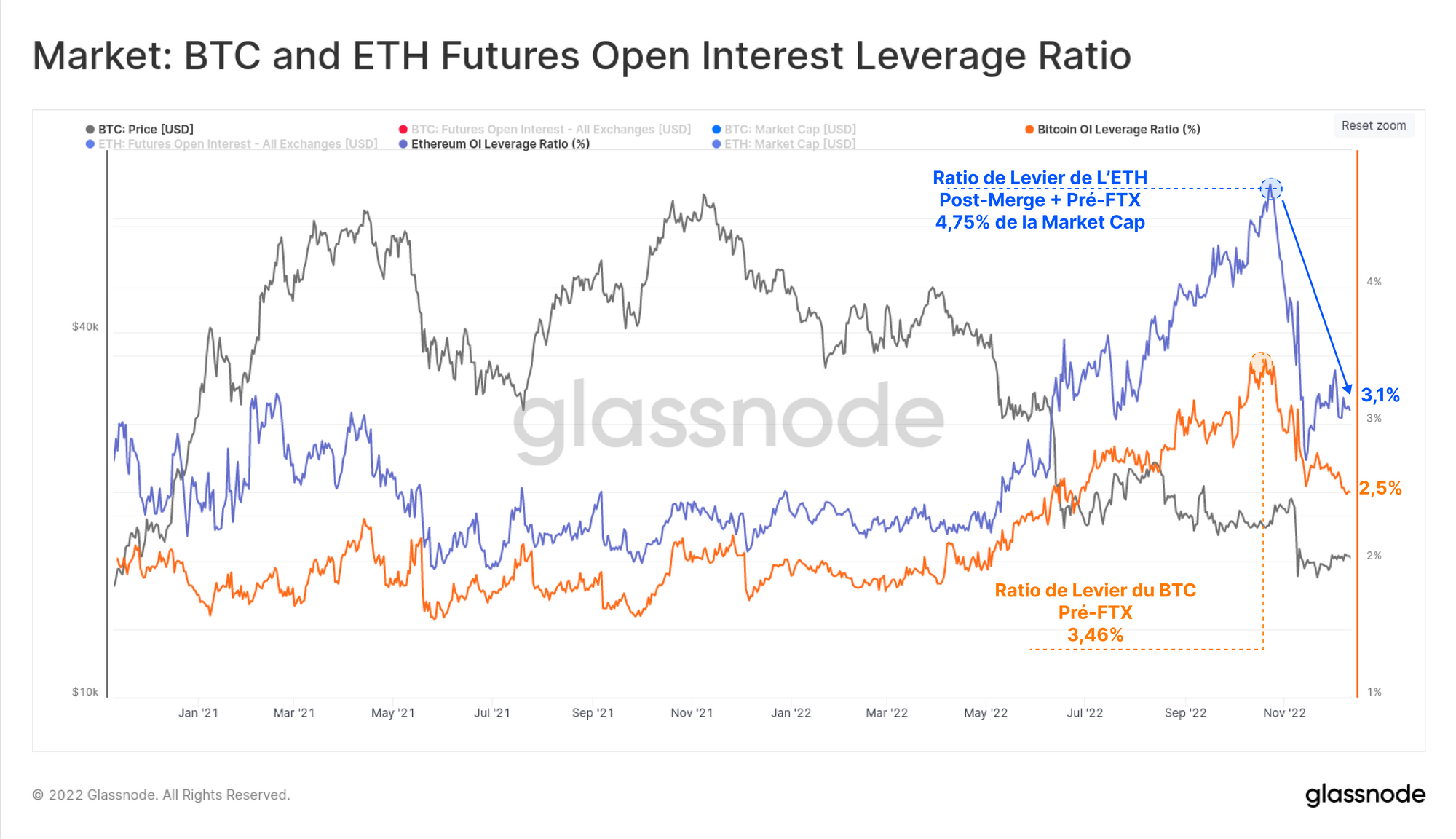 Le ratio de levier du BTC a atteint un pic une semaine avant les marchés de l'ETH, et a depuis baissé de 3,46% à 2,50% de sa capitalisation boursière au cours du mois dernier.