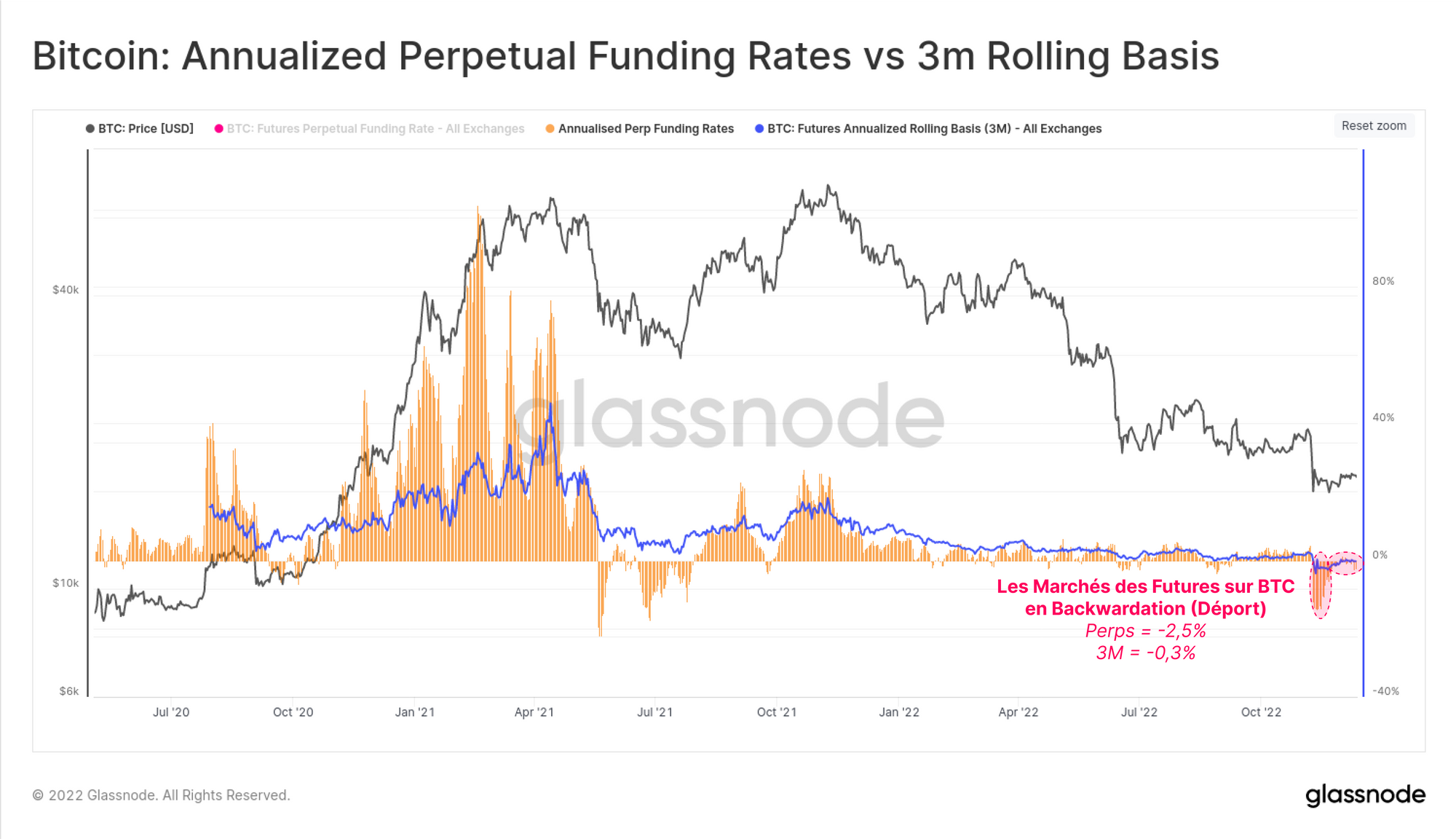 Les contrats à terme sur le bitcoin et les swaps perpétuels se négocient dans un état de backwardation, avec une base annualisée de -0,3 % et -2,5 %. Les périodes prolongées de backwardation sont rares, la seule période similaire étant la consolidation entre mai et juillet 2021.