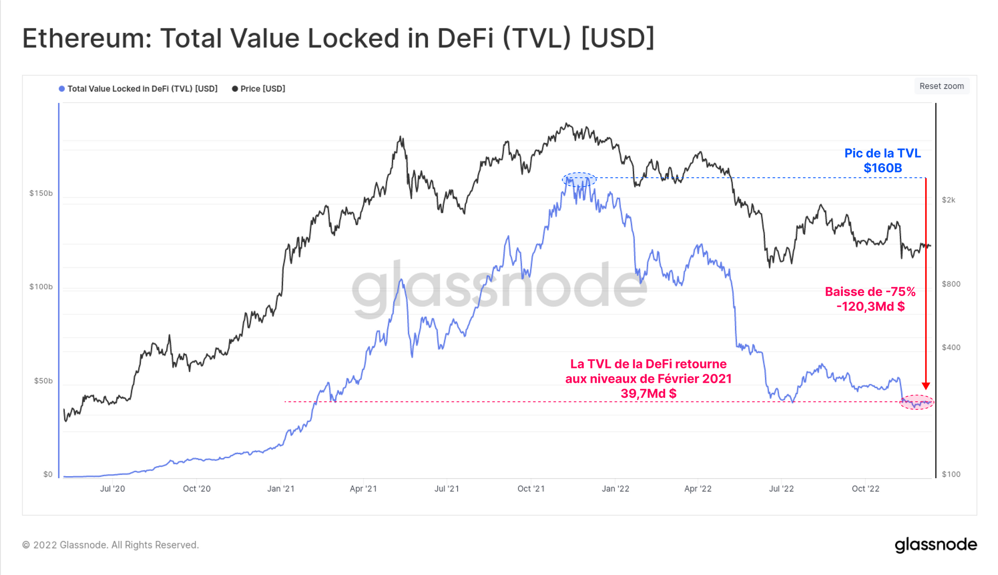 Après avoir atteint un pic de 160 milliards de dollars au moment de l'ATH du marché en novembre 2021, la TVL de la DeFi a chuté de plus de 120,3 milliards de dollars (-75%).