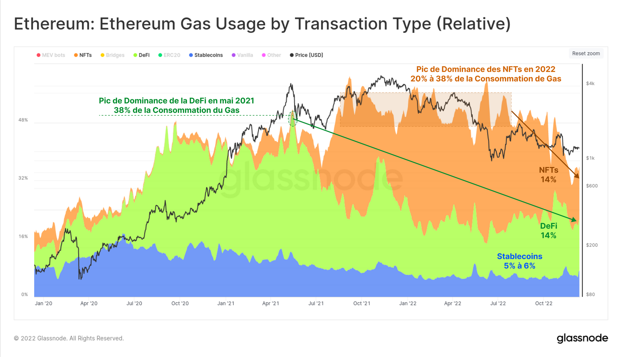 Dans un cycle similaire d'expansion et de ralentissement, les transactions liées aux NFT ont représenté entre 20 % et 38 % de la consommation de gaz jusqu'au premier semestre 2022, mais elles sont également tombées à 14 %.