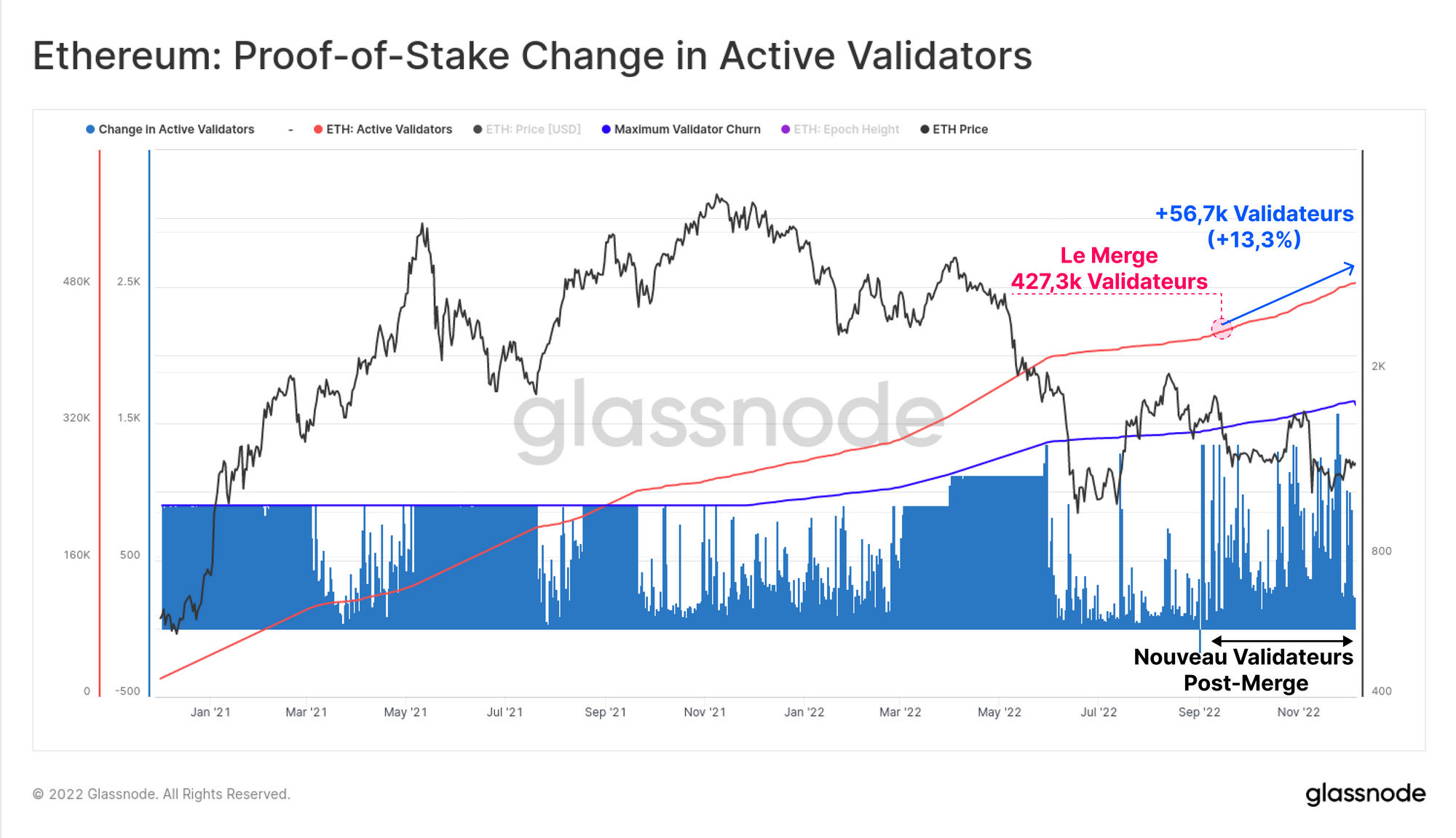 Depuis le Merge, le nombre de validateurs actifs a augmenté de 13,3%, avec plus de 484k validateurs maintenant opérationnels. Cela porte le total des ETH stakés à 15,618 millions d'ETH, ce qui équivaut à 12,89 % de l'offre en circulation.