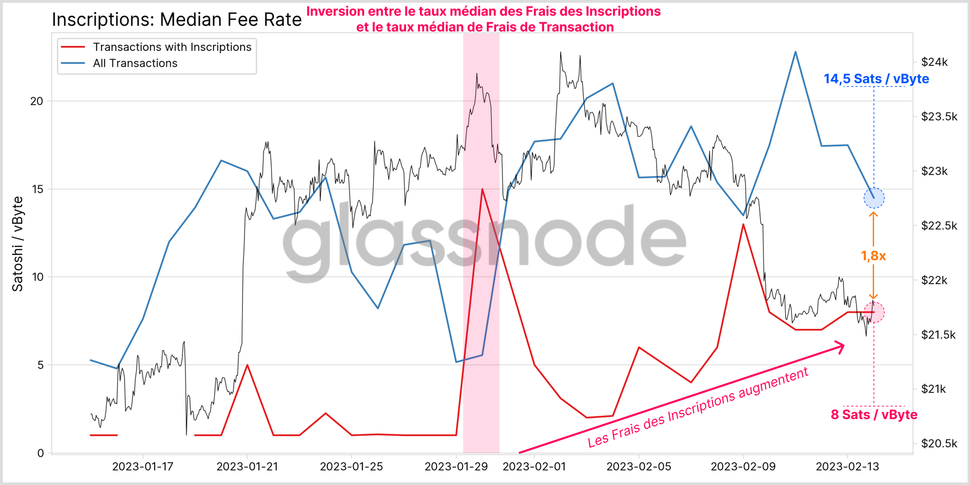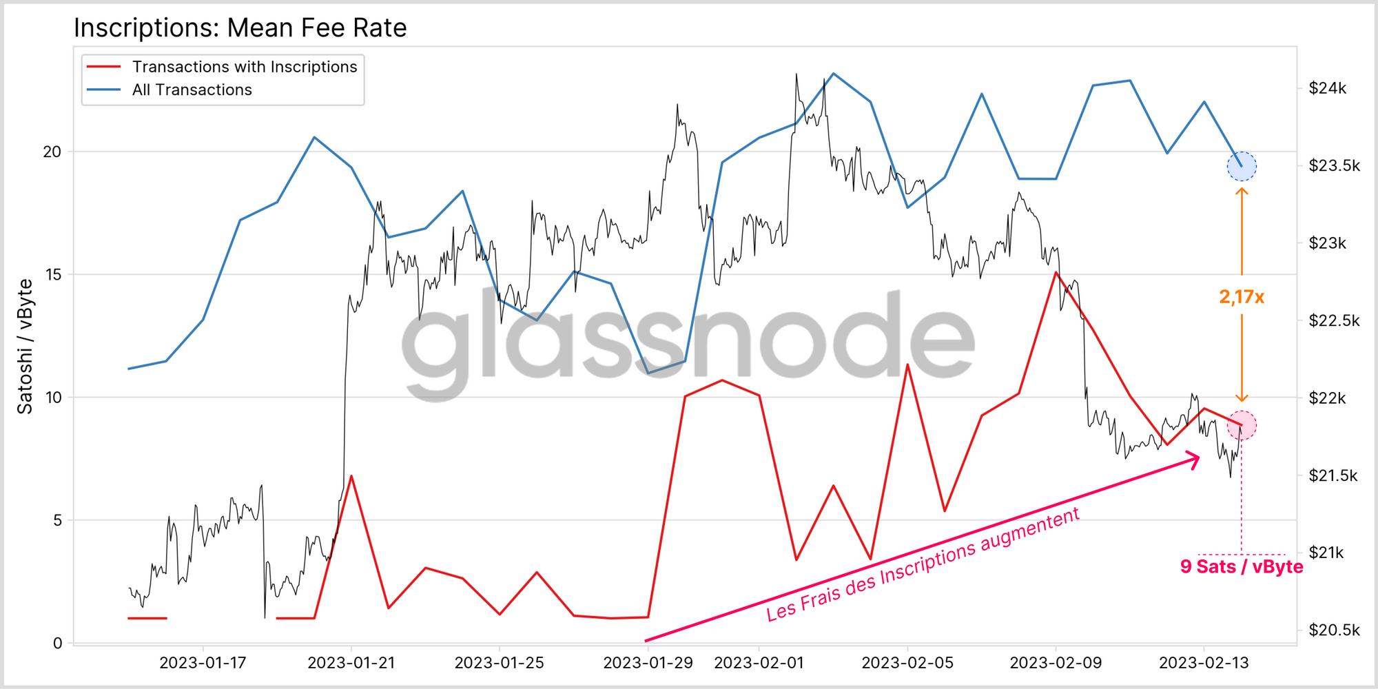 Enfin, nous pouvons comparer le taux moyen des frais de transaction payés par les Inscriptions. Une tendance à la hausse des frais d'inscription moyens 🔴 peut être observée tout au long du mois de février, avec un pic à un taux de 15 sats/vByte. Actuellement, la transaction moyenne (monétaire et Inscriptions) est 2,17x plus chère qu'une Inscription seule.