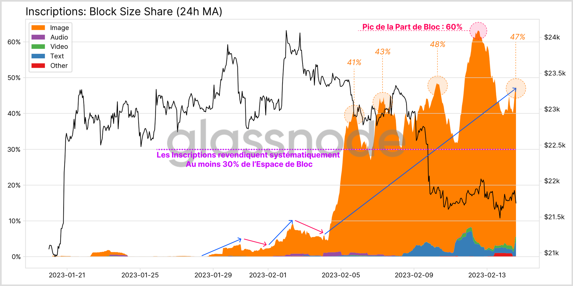 Le pourcentage d'espace de bloc consommé par les transactions Inscriptions a augmenté de façon spectaculaire tout au long du mois de février, remplissant 47 % de tout l'espace de bloc disponible, avec un pic de 60 %.