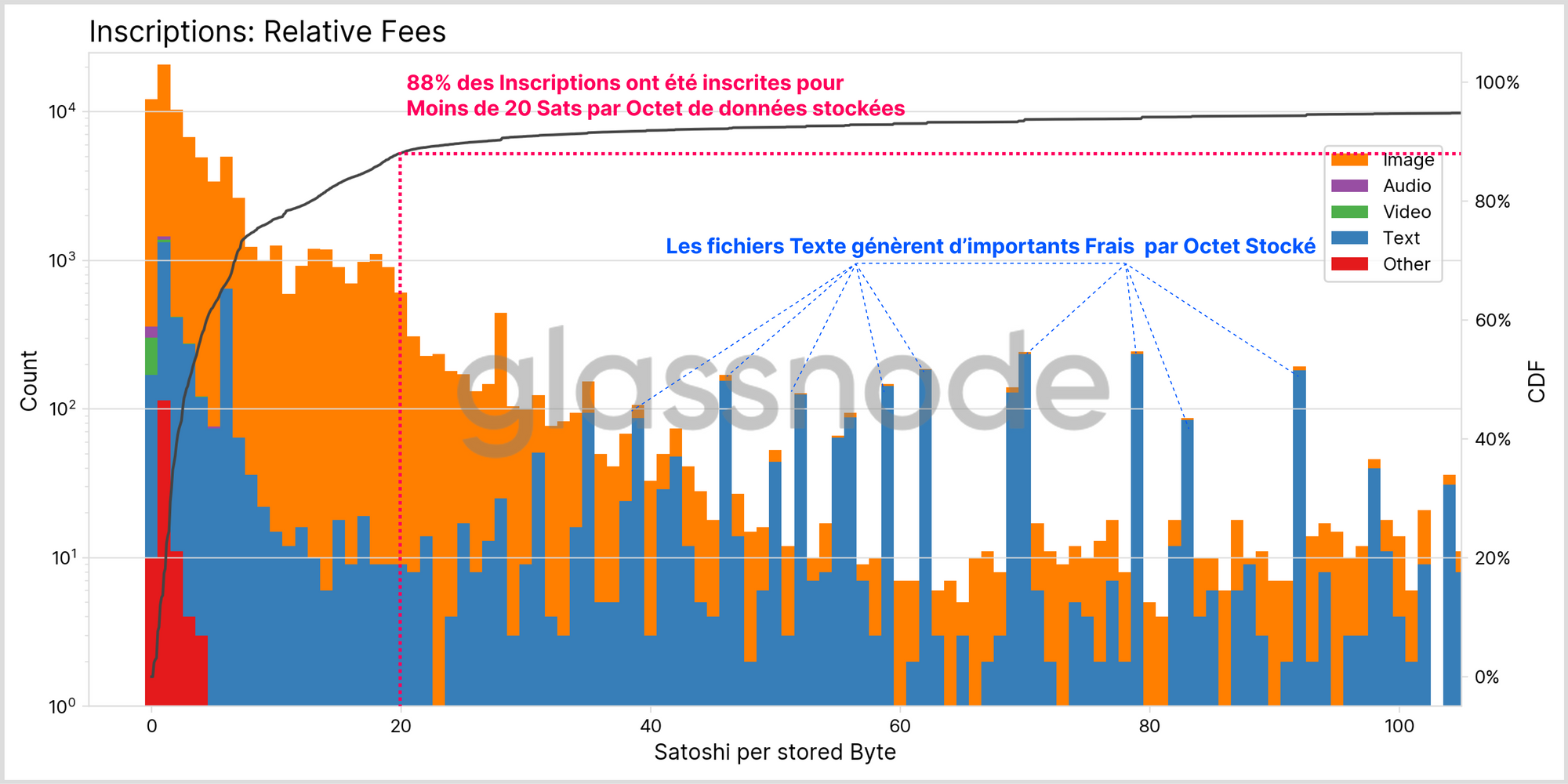 Les frais payés pour 88% de toutes les Inscriptions étaient inférieurs à 20 sats/octet de données stockées. Les Inscriptions d'images choisissent en moyenne de payer des frais relativement bas, tandis que les Inscriptions de textes présentent un plus grand degré de variation et sont généralement prêtes à payer des frais plus élevés.