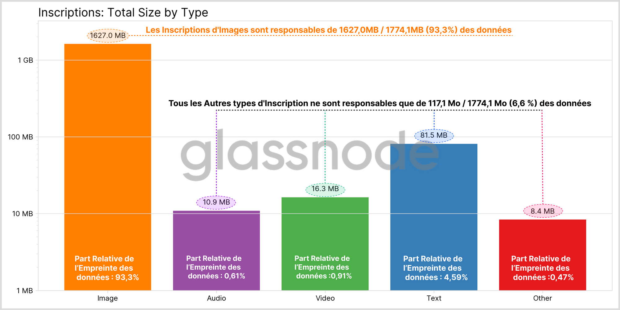 Cette part est largement dominée par les Inscriptions d'images, dont la popularité et la dominance ne cessent de croître. Les fichiers texte connaissent une croissance régulière, avec des Inscriptions approchant un pic de dominance de 6,5 % de toutes les transactions Inscriptions.