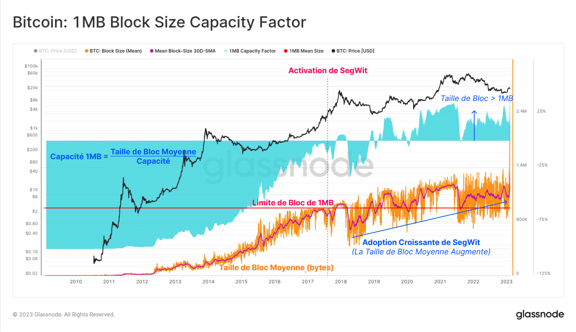 Le graphique ci-dessous montre comment la taille moyenne des données d'un bloc Bitcoin a dépassé le plafond de 1 Mo après le soft fork SegWit.