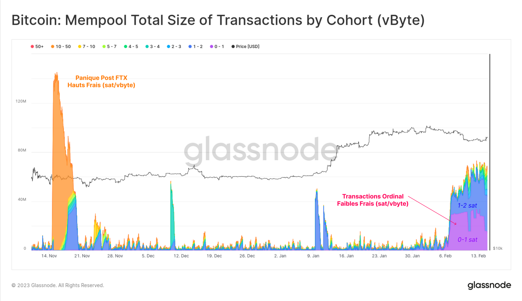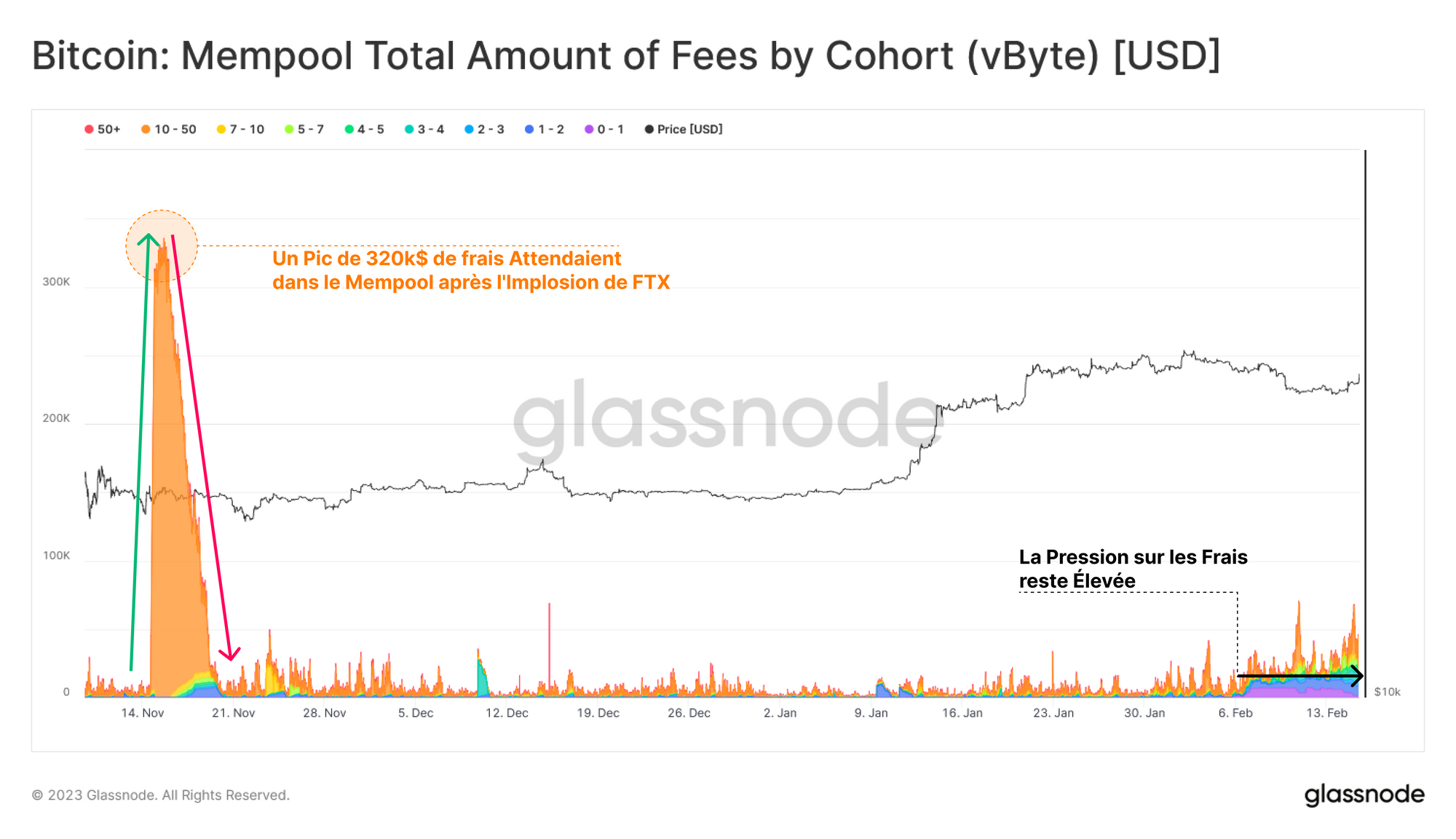 La pression de FTX a été résolue en une semaine, tandis que les Inscriptions ont fait passer la pression tarifaire de base de 1 à environ 4 sat/vByte tout au long du mois de février.