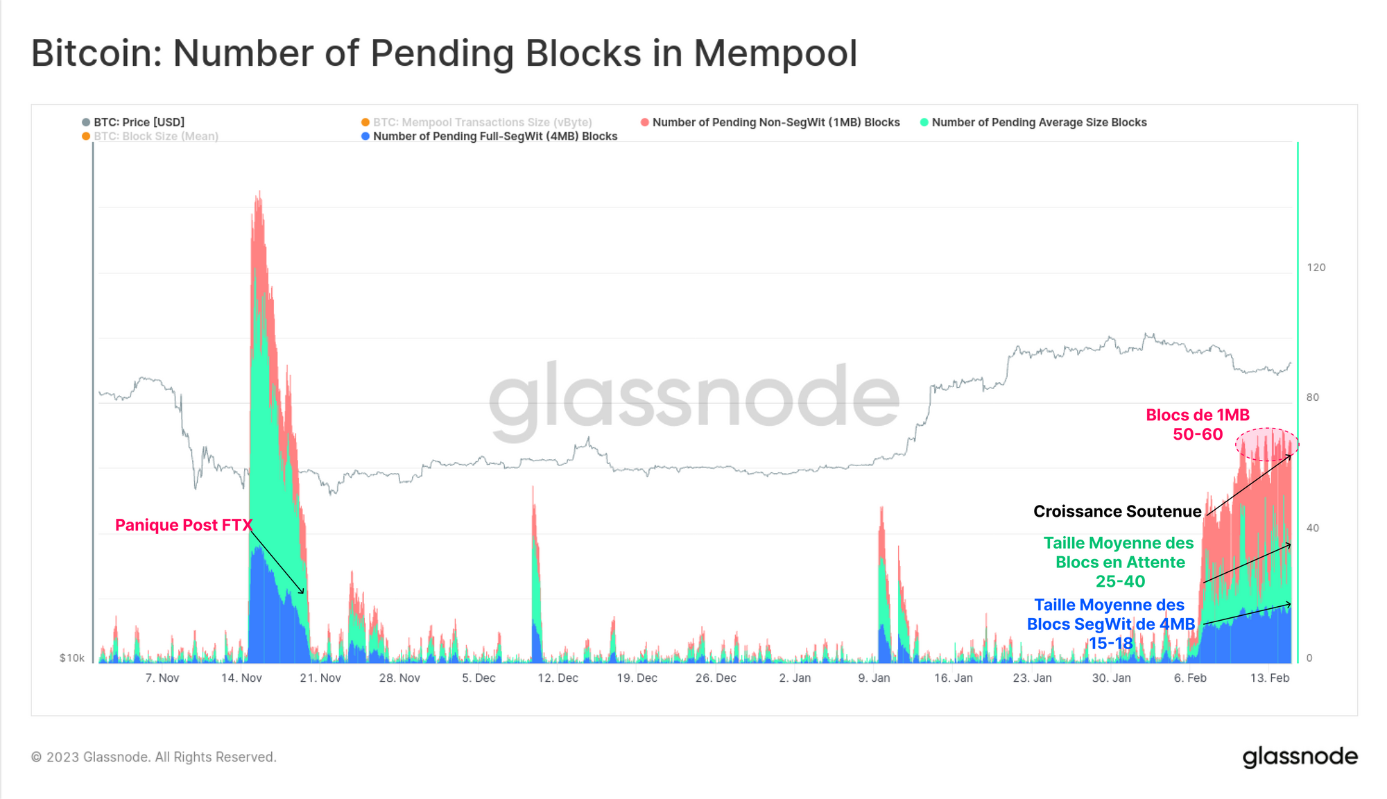 Pour les Inscriptions, nous pouvons en fait constater une augmentation progressive de la demande d'espace de bloc, avec une croissance soutenue du nombre de blocs en attente.