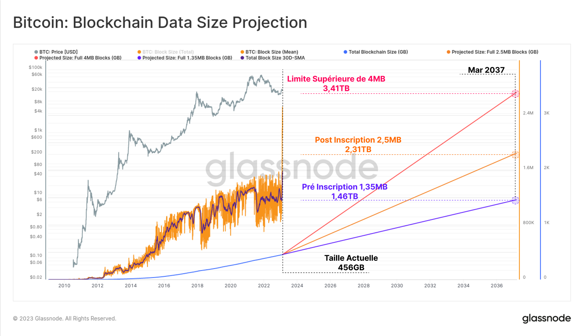 L'un des sujets de débat les plus importants concernant les Inscriptions est son potentiel impact à long terme sur la taille totale des données de la blockchain Bitcoin, la propagation des blocs minés par les mineurs et les retombées possibles sur la synchronisation complète des nœuds.