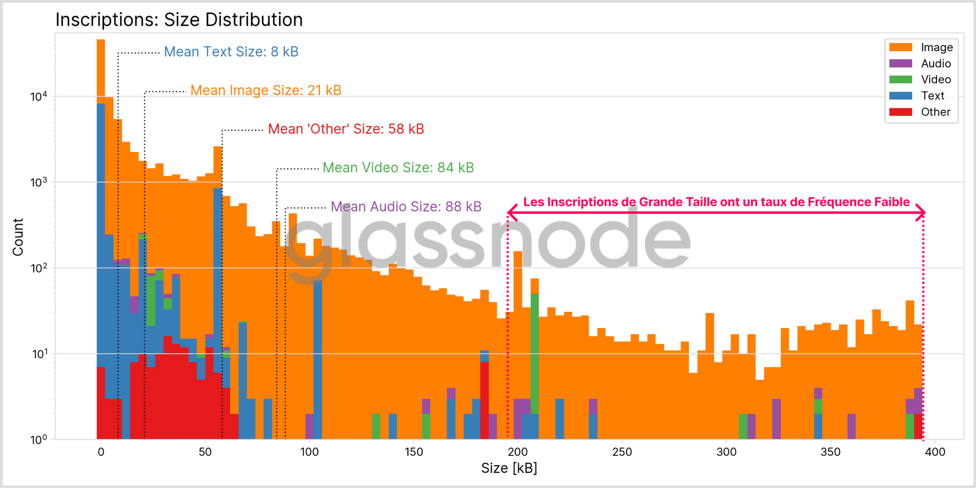 En observant le nombre de transactions Inscriptions en fonction de leur taille, nous constatons que les Inscriptions de grande taille ont une fréquence significativement plus faible, de plusieurs ordres de grandeur, que les transactions de petite taille.