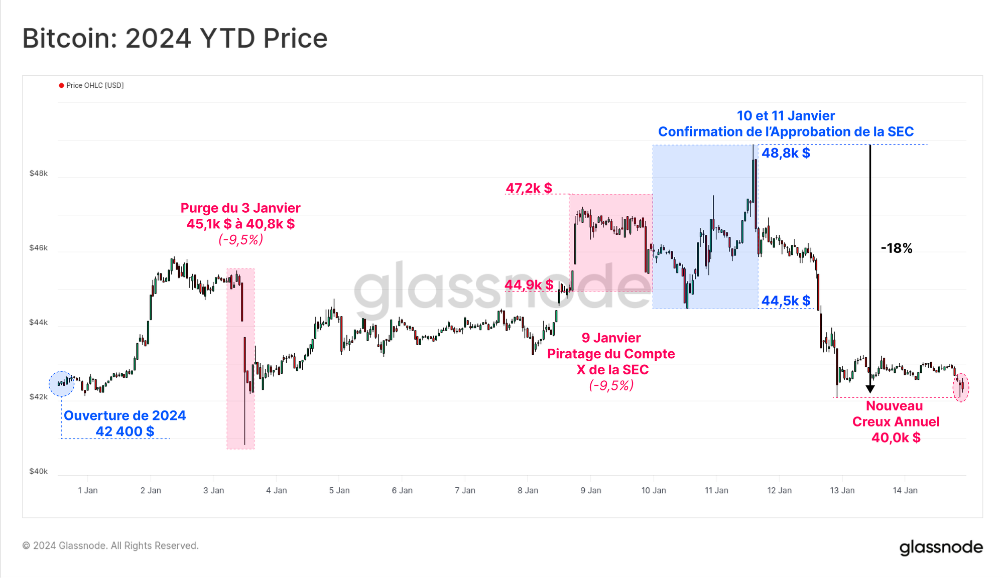 L'approbation des ETF a connu un faux départ le 9 janvier, après que le compte X de la SEC a été compromis, affichant un faux avis d'approbation positive. Les prix du BTC ont grimpé jusqu'à 47,2k dollars, avant de redescendre rapidement à 44,5k dollars lorsque la réalité s'est imposée.