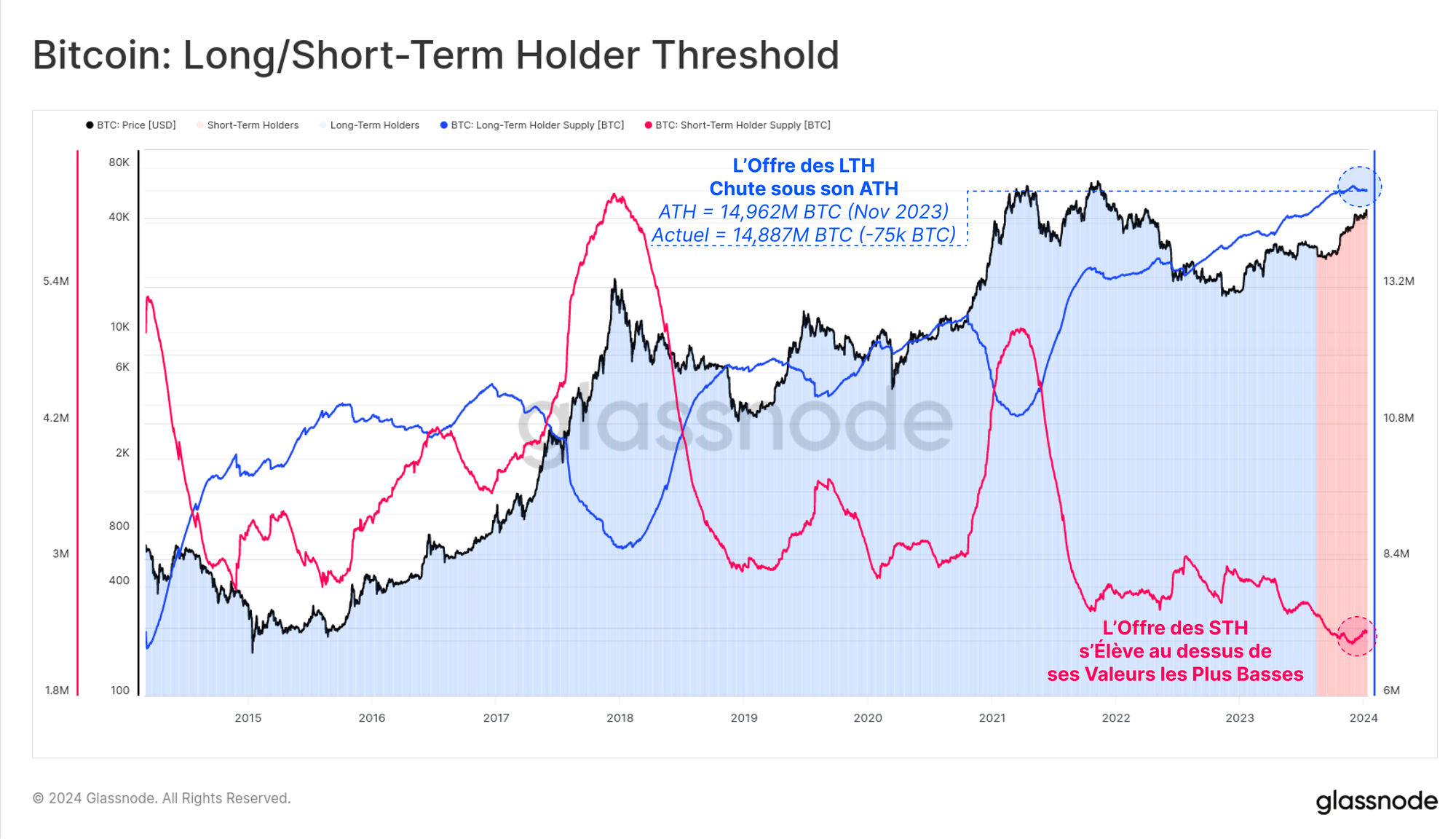 L'offre des détenteurs à long terme s'est aussi légèrement éloignée de son ATH, diminuant de ~75k BTC depuis novembre, les pièces plus anciennes étant dépensées pour réaliser des bénéfices.
