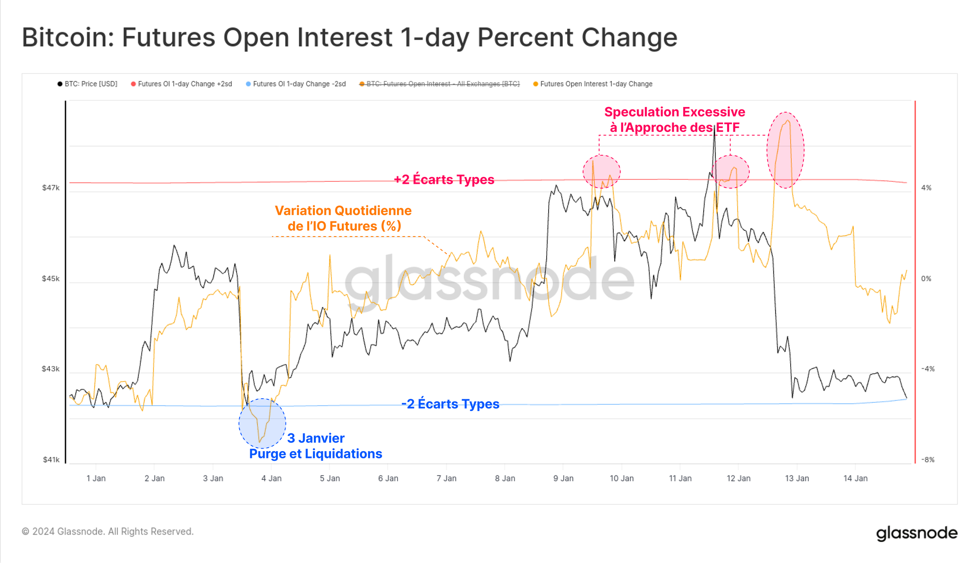 À l'inverse, le stock d'investissement a considérablement augmenté entre le 9 et le 11 janvier, lorsque la spéculation sur les ETF a atteint son apogée et que les prix ont frôlé les 49 000 dollars. Cette hausse a été accueillie par une vente qui a ramené les prix vers les 40 000 dollars.