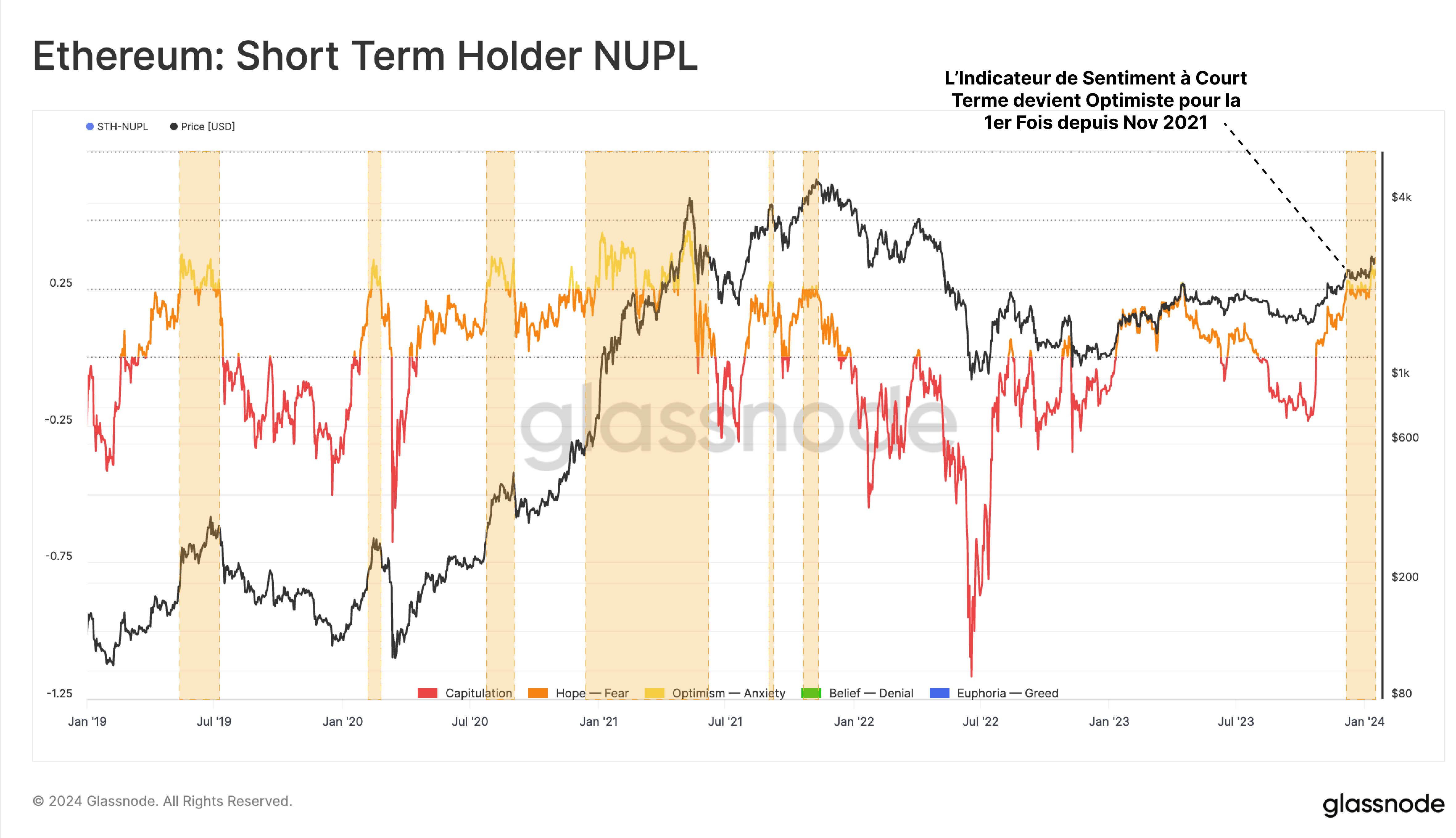 Le sentiment positif du marché pour l'ETH est soutenu par un autre indicateur : Le Net Unrealized Profit/Loss (NUPL) des détenteurs à court terme. Le STH-NUPL a dépassé 0,25 pour la première fois depuis l'ATH de novembre 2021.