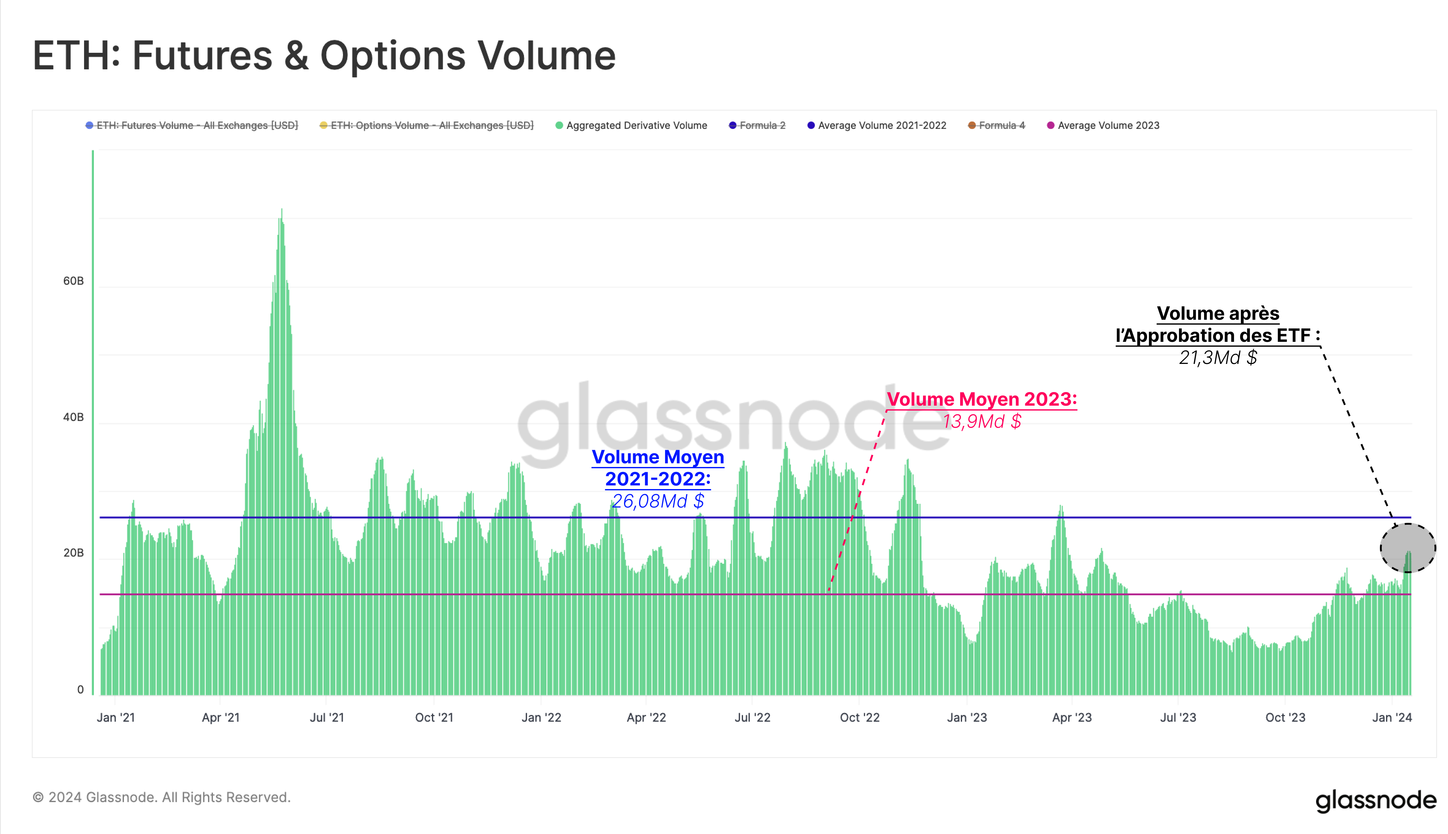 Au total, les marchés de l'ETH ont enregistré un volume d'échanges de 21,3 milliards de dollars par jour, dépassant le volume moyen de 2023 (13,9 milliards de dollars), mais il est encore loin des niveaux typiques observés entre 2021 et 2022.