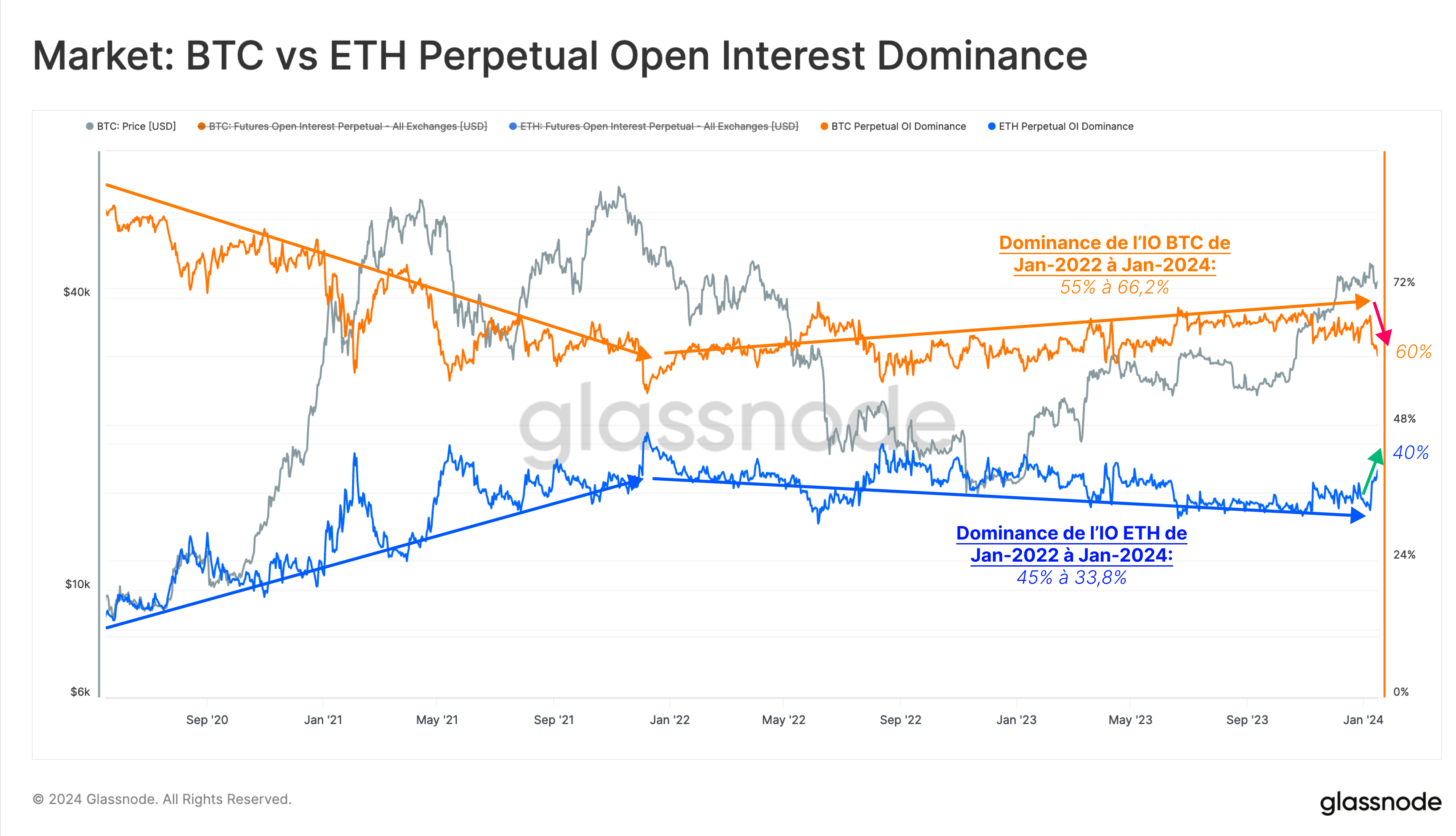 À l'inverse, la dominance de l'intérêt ouvert de l'ETH a diminué de 45 % à 33,8 % entre 2022 et 2024. Cependant, après l'approbation de l'ETF, l'ETH a regagné des parts de marché, sa position dominante remontant à ~40 %.