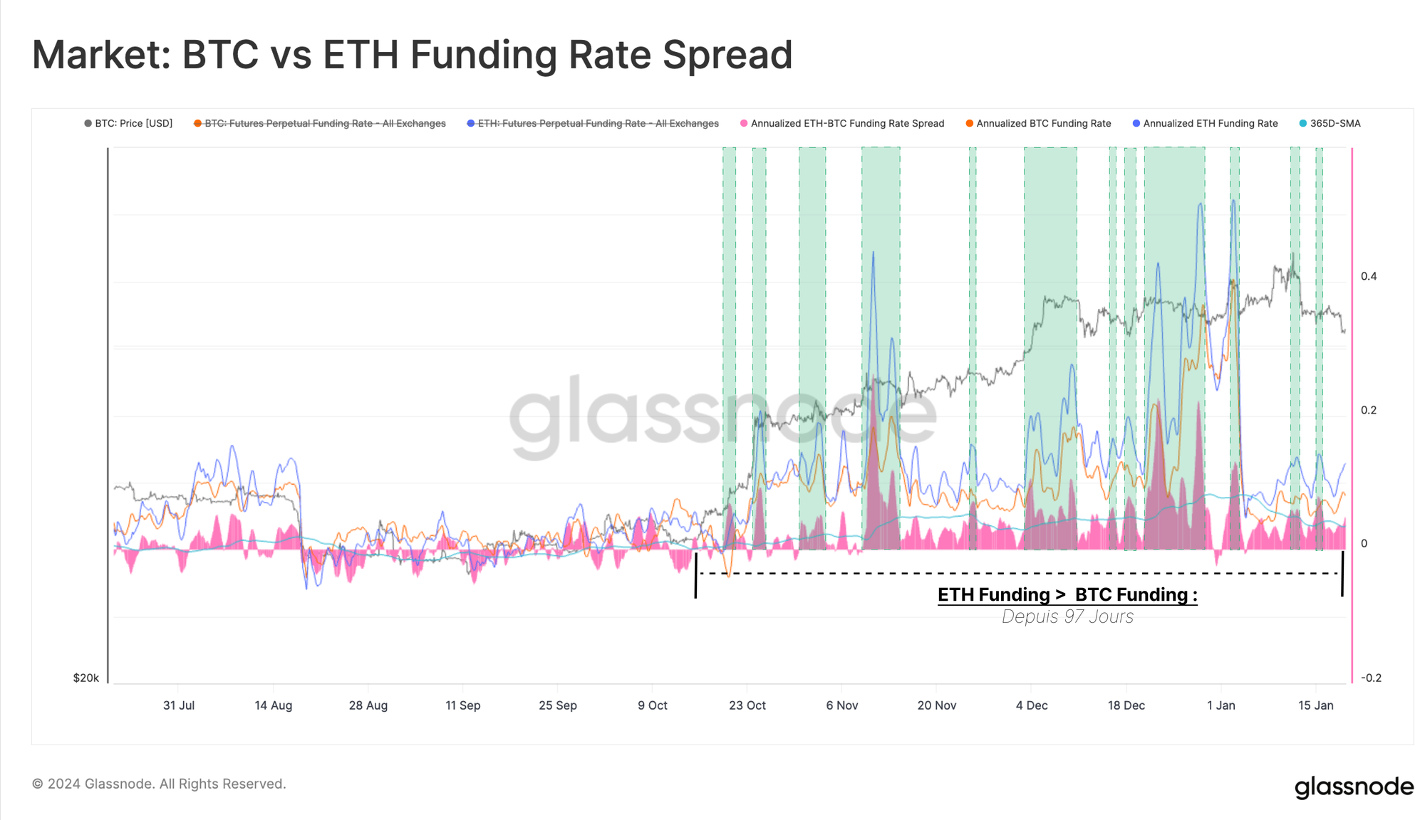 Il est intéressant de noter que lorsque l'écart entre les taux de financement de l'ETH et du BTC dépasse sa moyenne sur un an, il s'aligne généralement sur les pics locaux des prix de l'ETH.