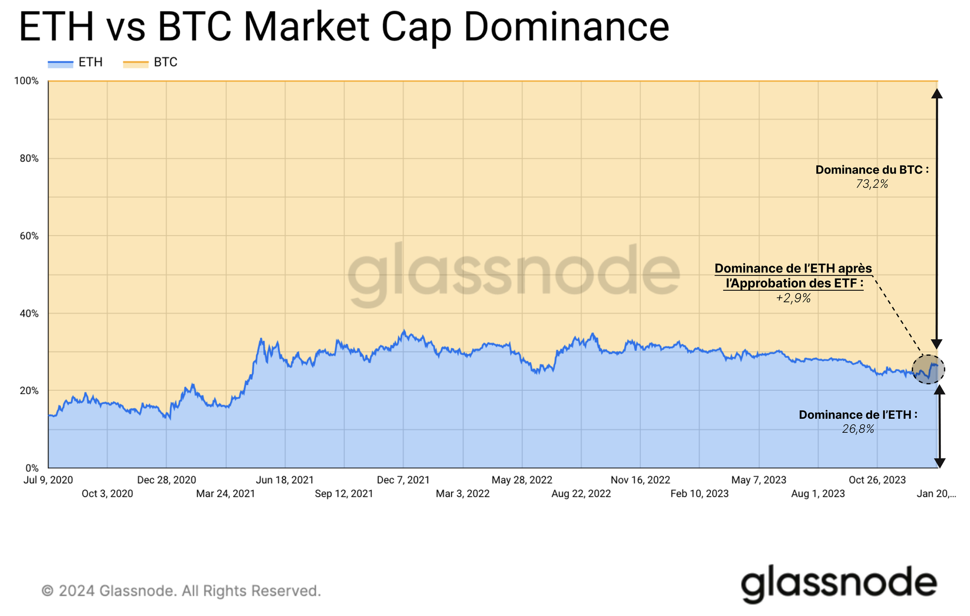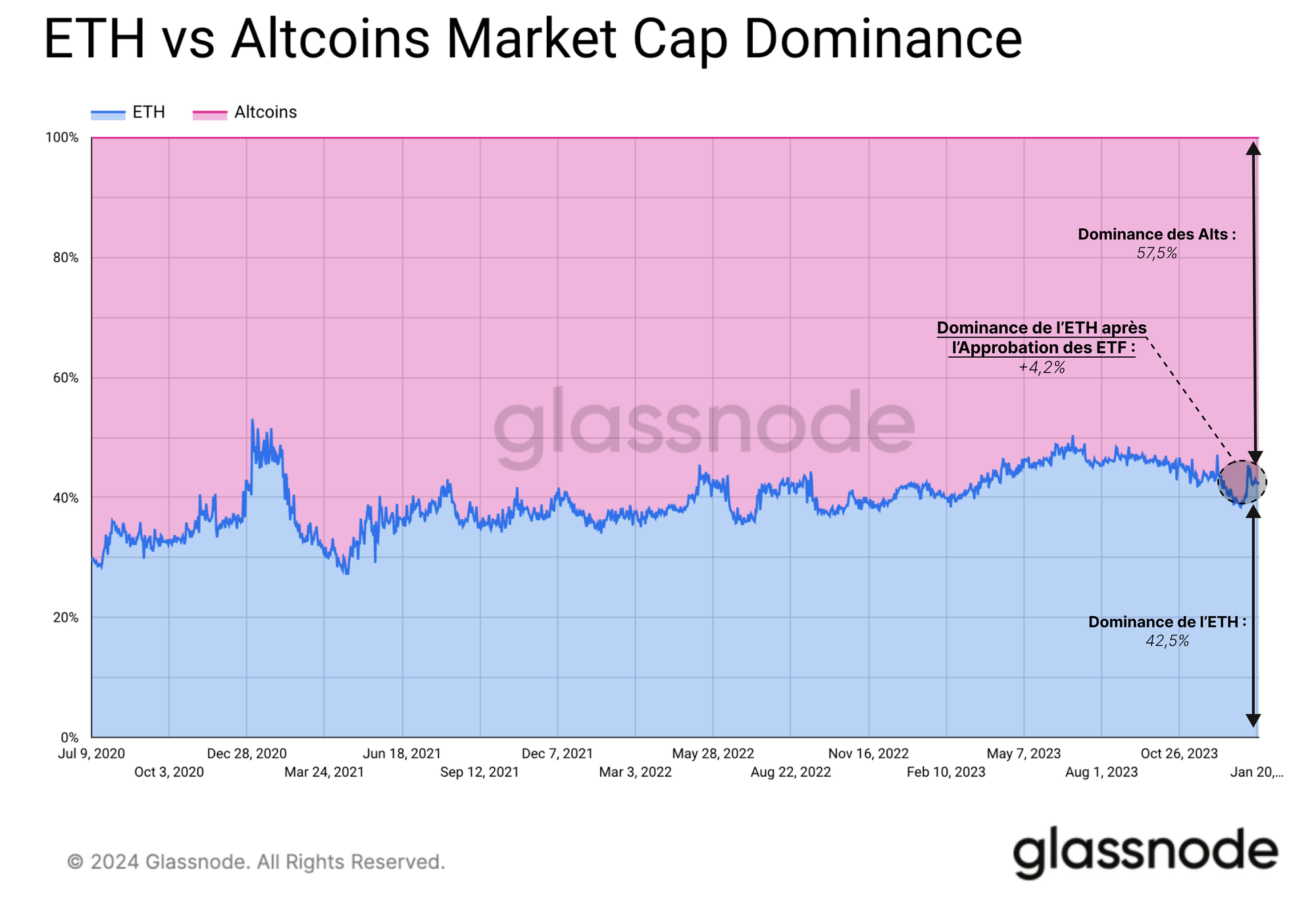 Cependant, par rapport à l'ETH, les altcoins n'ont tout simplement pas tenu le coup ces dernières semaines. L'ETH a surpassé les altcoins en général, gagnant +4,2 % en termes de dominance. Cela fait de l'ETH le plus grand gagnant des mouvements du marché après l'approbation de l'ETF.