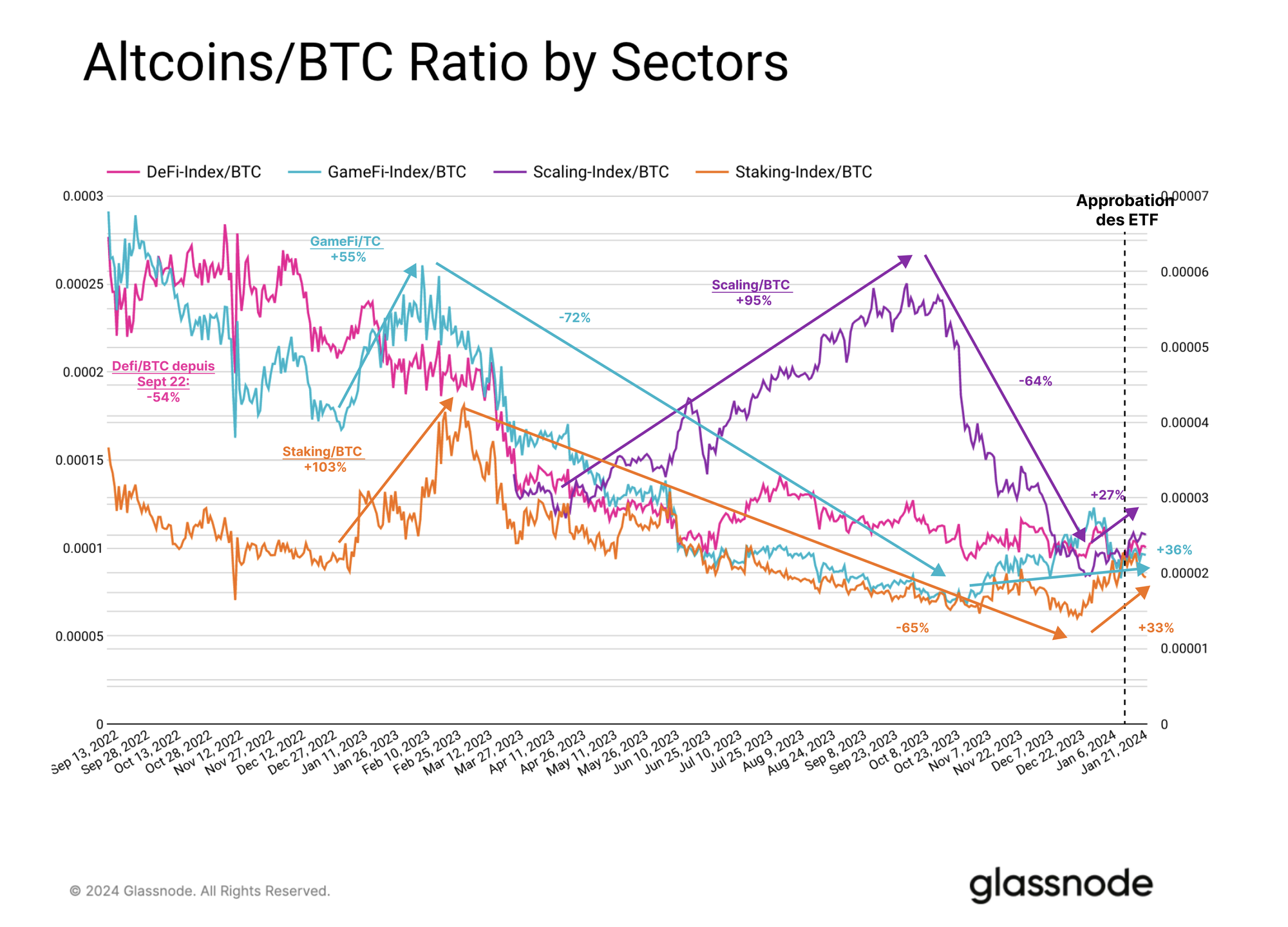 Les tokens descaling ont atteint leur performance maximale plus tard dans l'année, voyant le ratio Scaling/BTC augmenter de +95% au T2 et au T3 2023. Il est important de noter que ARB n'a été lancé qu'en mars 2023, ce qui a probablement déclenché cette surperformance.