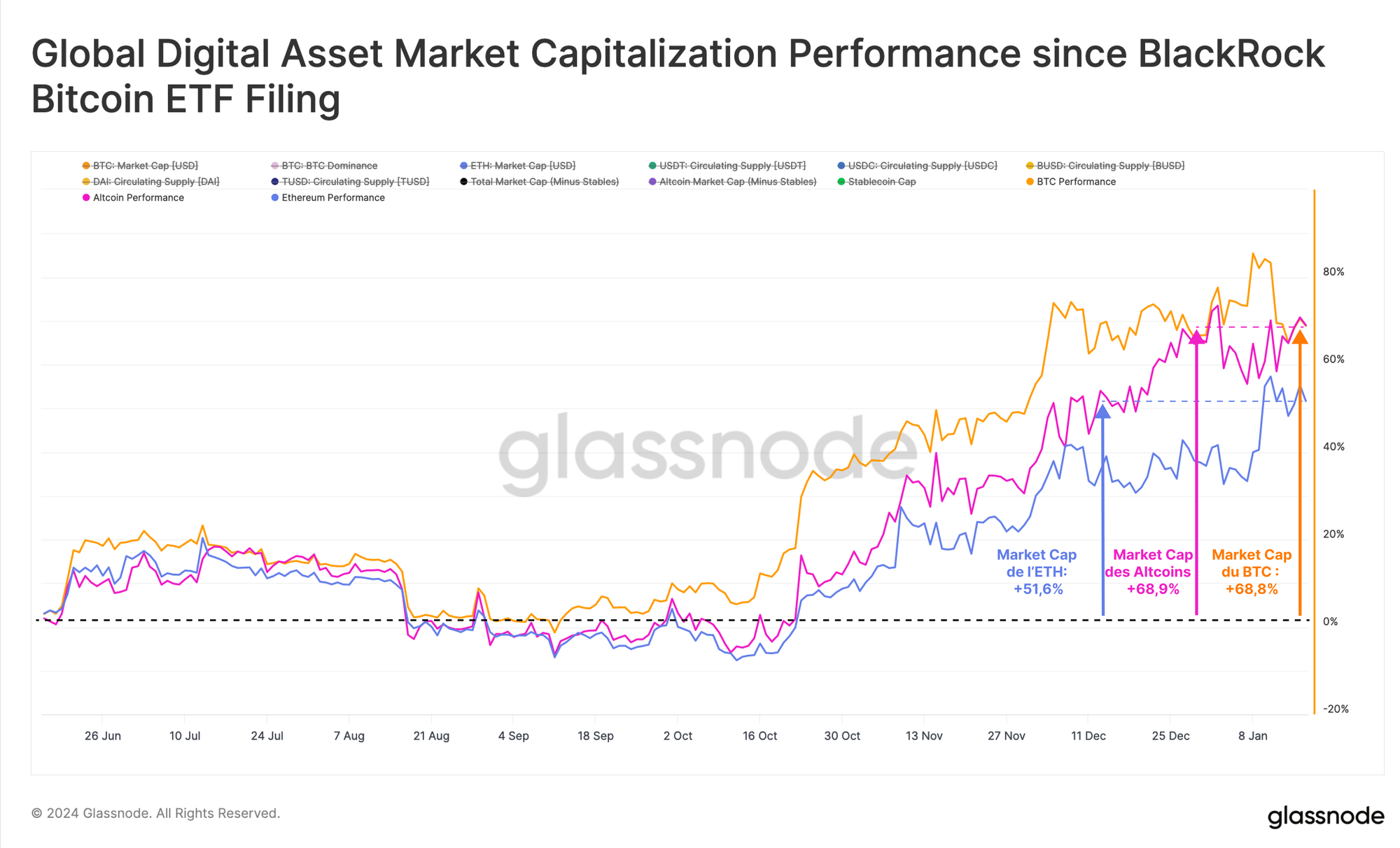 La capitalisation boursière du BTC a augmenté de 68,8 % depuis que BlackRock a déposé sa première demande d'ETF, et la capitalisation boursière globale des altcoins a suivi le mouvement, augmentant de 68,9 %. Cependant, l'Ethereum a connu une dynamique relative plus lente, sous-performant le secteur altcoin de -17%.