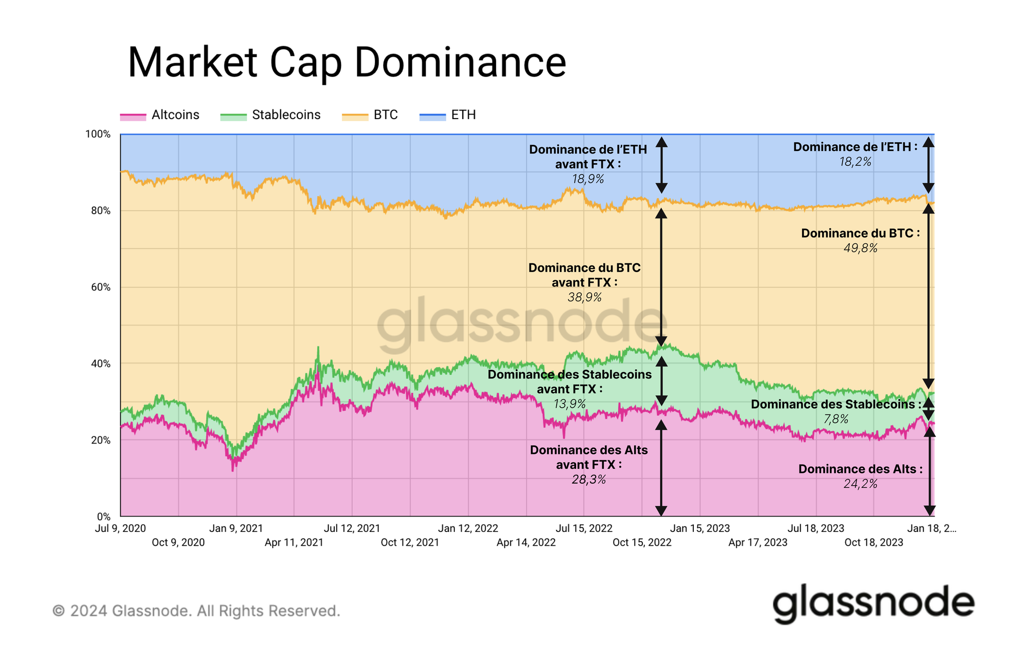 En regardant en arrière, nous pouvons voir que le BTC a généralement été de plus en plus dominant au cours des dernières années. Depuis l'effondrement de FTX en novembre 2022, la dominance de la capitalisation du BTC est passée de 38,9 % à 49,8 %.