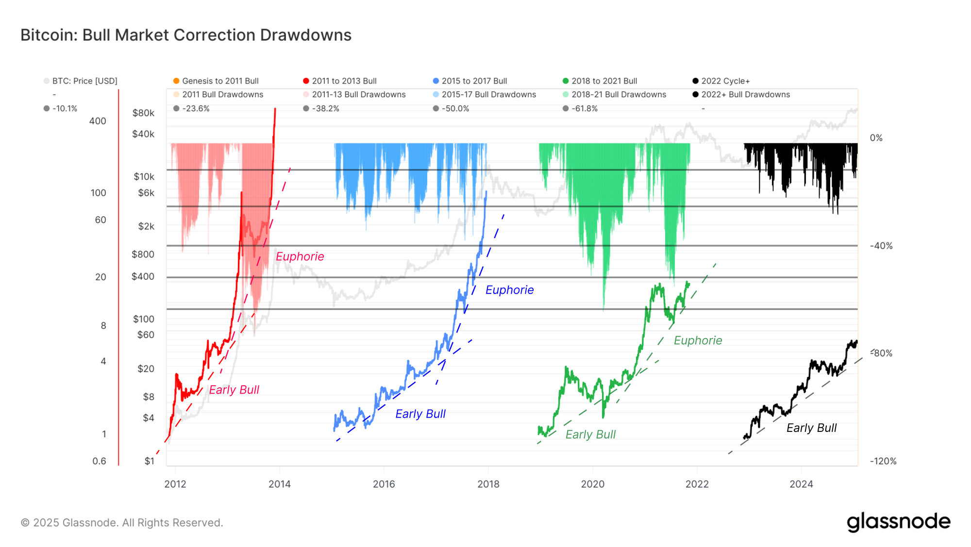 Bien que le BTC se possède à une capitalisation boursière supérieure de plusieurs ordres de grandeur, la baisse typique par rapport au sommet local a rarement dépassé -25 %.