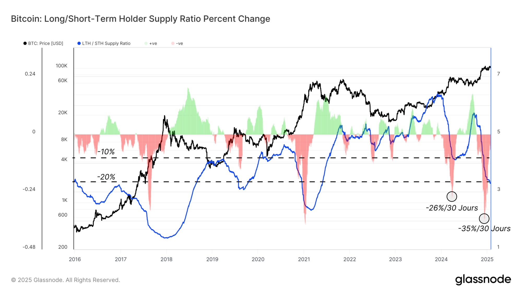 Une tendance à la hausse indique une prédominance des comportements d'accumulation et de HODLing, car moins de BTC anciens sont dépensées et plus de BTC migrent vers le statut de détenteur à long terme. À l'inverse, une baisse de ce ratio indique une forte distribution des LTH.